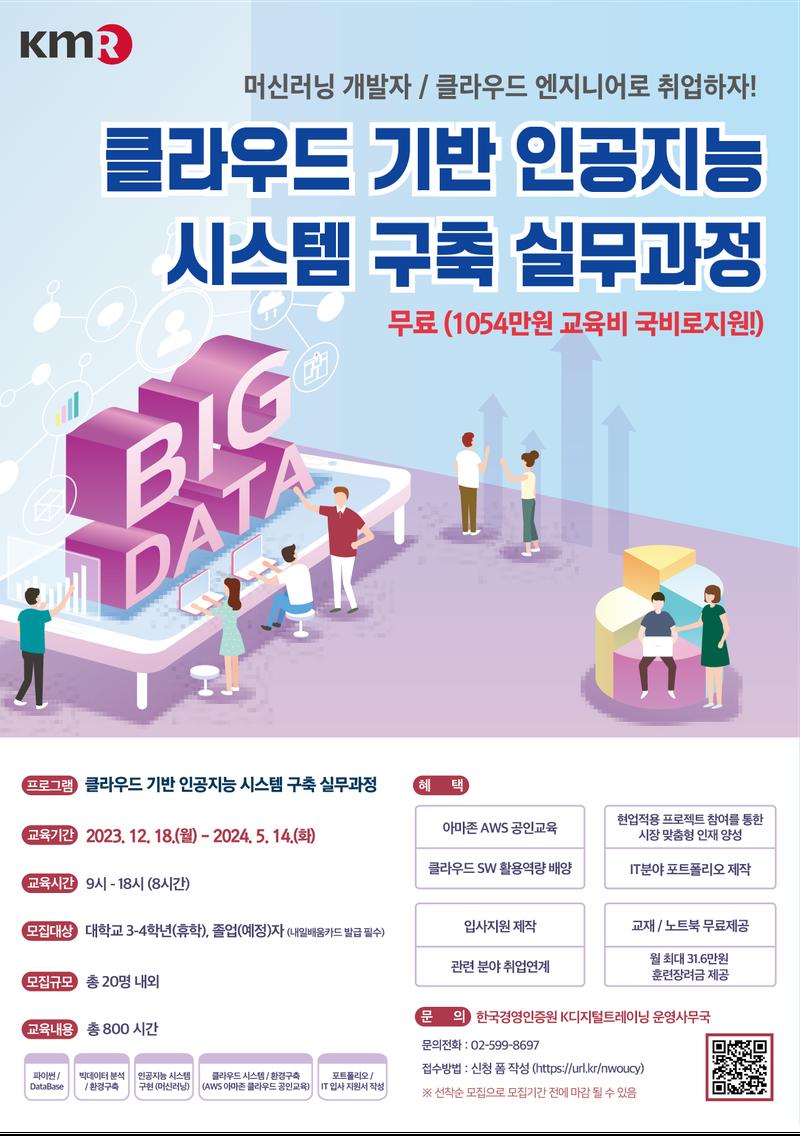 AWS 기반의 빅데이터, AI 융합 분야 SW기업에 취업을 희망 하는 교육생을 모집합니다.