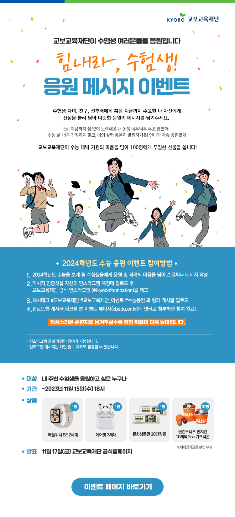 교보교육재단이 수능 대박 기원의 마음을 담아 추첨을 통해 100명에게 푸짐한 선물을 쏩니다!
