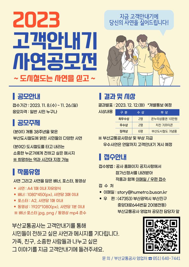 부산교통공사는 역사 내 새로 설치한 ‘고객안내기’를 활용하여, 시민과 따뜻한 사연을 나누고 공감대를 키우기 위해 ‘2023년 고객안내기 사연 공모전’을 시행하고자 합니다. 개통 38주년을 맞은 부산도시철도를 소재로 한 다양한 사연과 경험담을 작성해주세요. 가족, 친구, 소중한 누군가에게 고객안내기가 대신 전해주었으면 하는 메시지도 기다리겠습니다. 부산도시철도와 의미 깊은 연말을 보내고자 하는 시민 여러분의 많은 참여를 바랍니다.