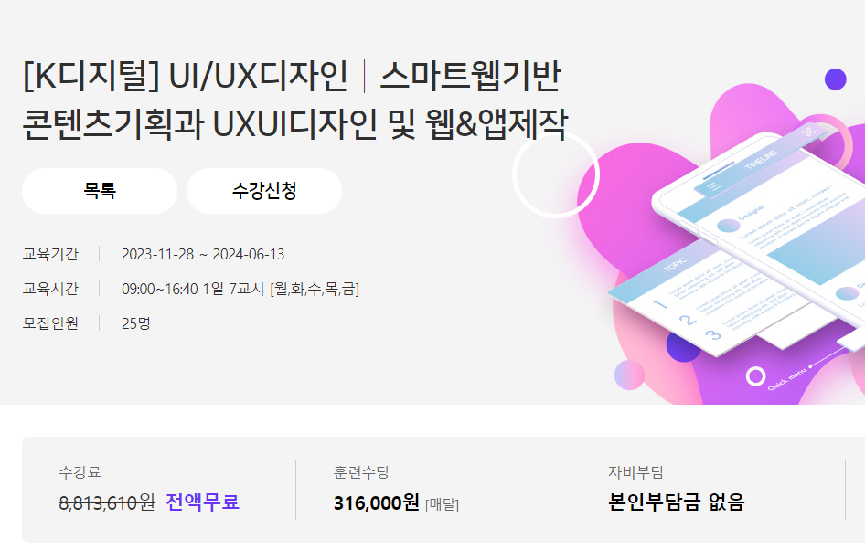 사전지식을 요구하지 않으며 100% 수강료 지원, 오히려 훈련장려금이 지급됩니다.