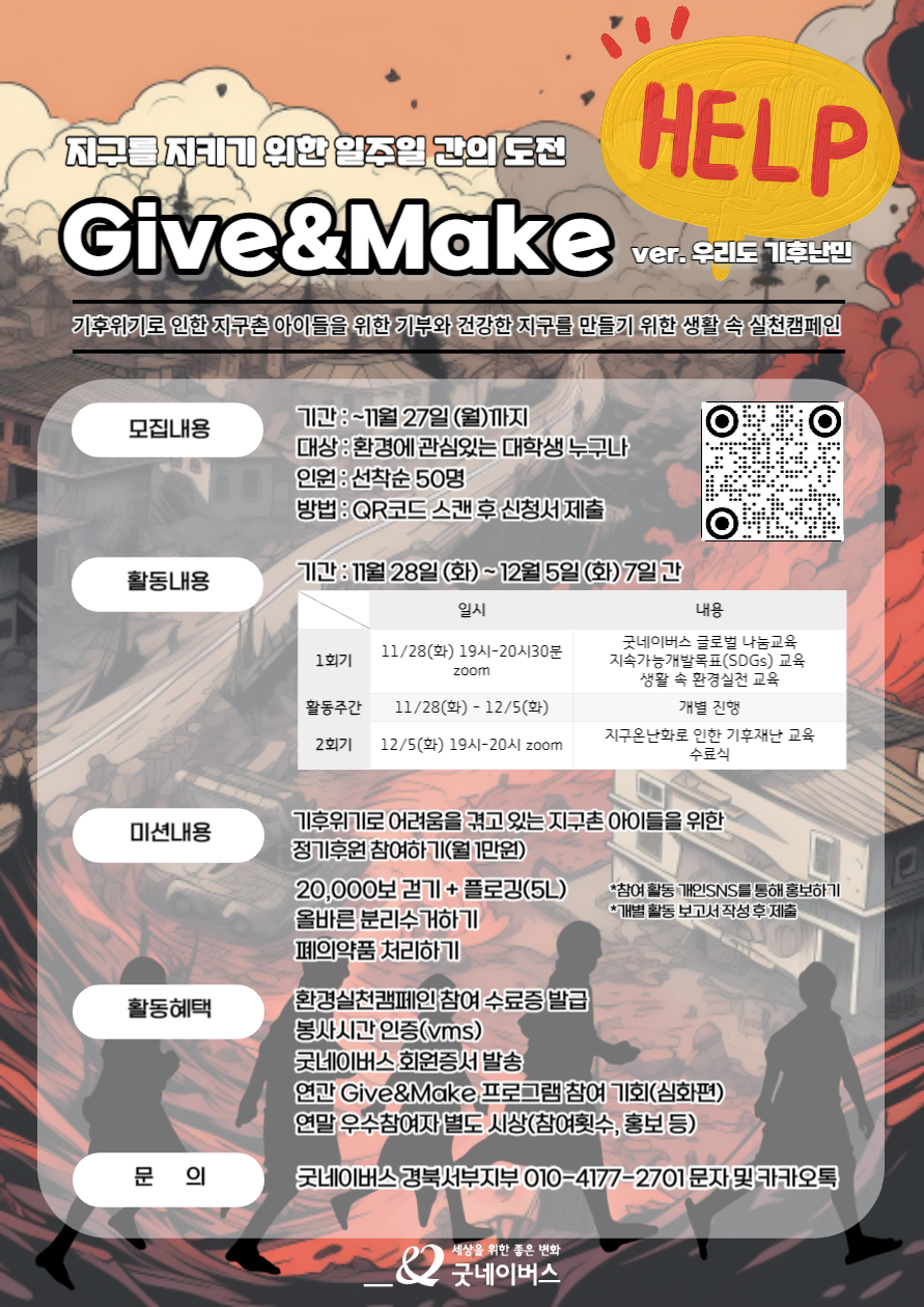 - NGO, 굿네이버스, 지속가능개발목표(SDGs)와 기후위기에 대한 교육내용을 포함한 실천활동 프로그램입니다.