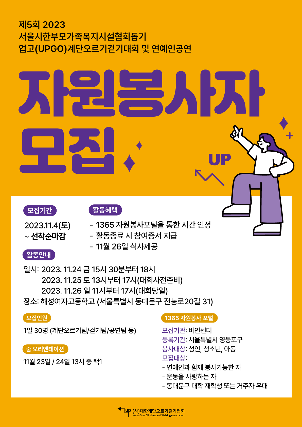 (사)대한계단오르기협회에서 “연예인 봉사단”과 함께 「2023년 서울시한부모가족복지시설협회」 돕기 업고(UPGO) 계단오르기걷기 대회를 진행합니다.