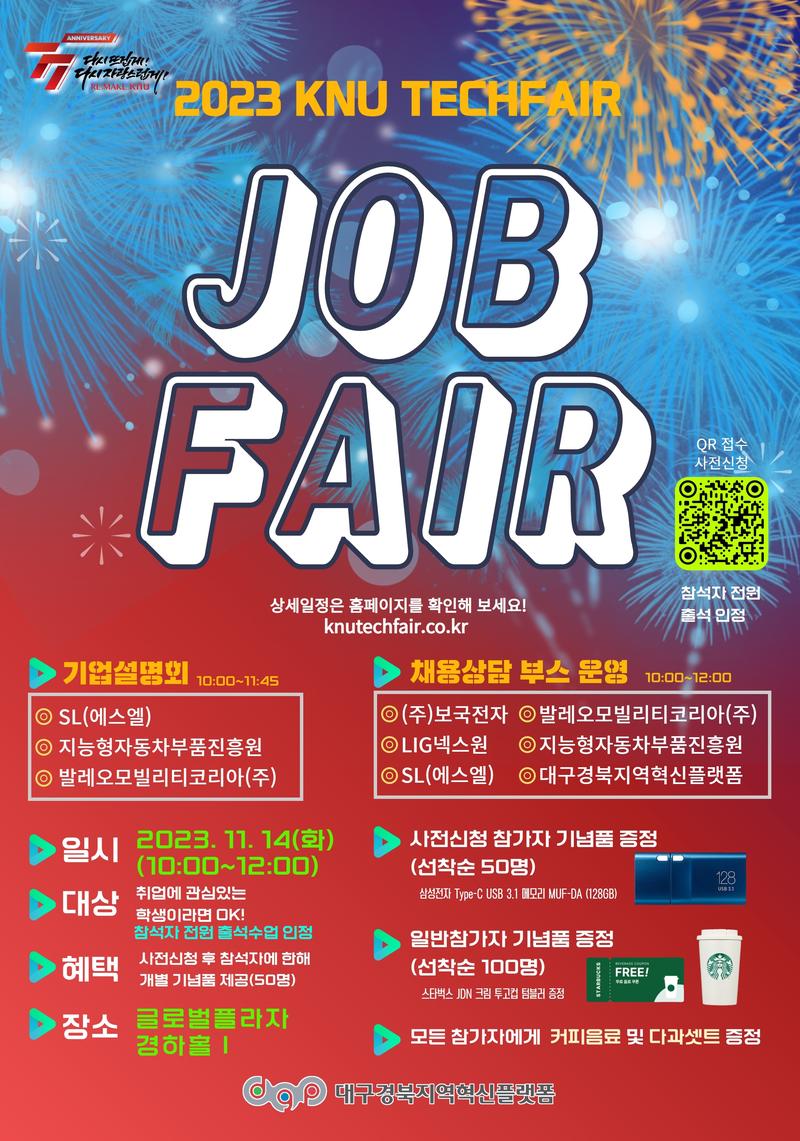 2023 경북대학교 테크페어 內「지자체-대학 협력기반 지역혁신 사업(RIS) JOB FAIR」를 개최하오니 본 행사에 관심 있는 학생들의 많은 참여 바랍니다.
