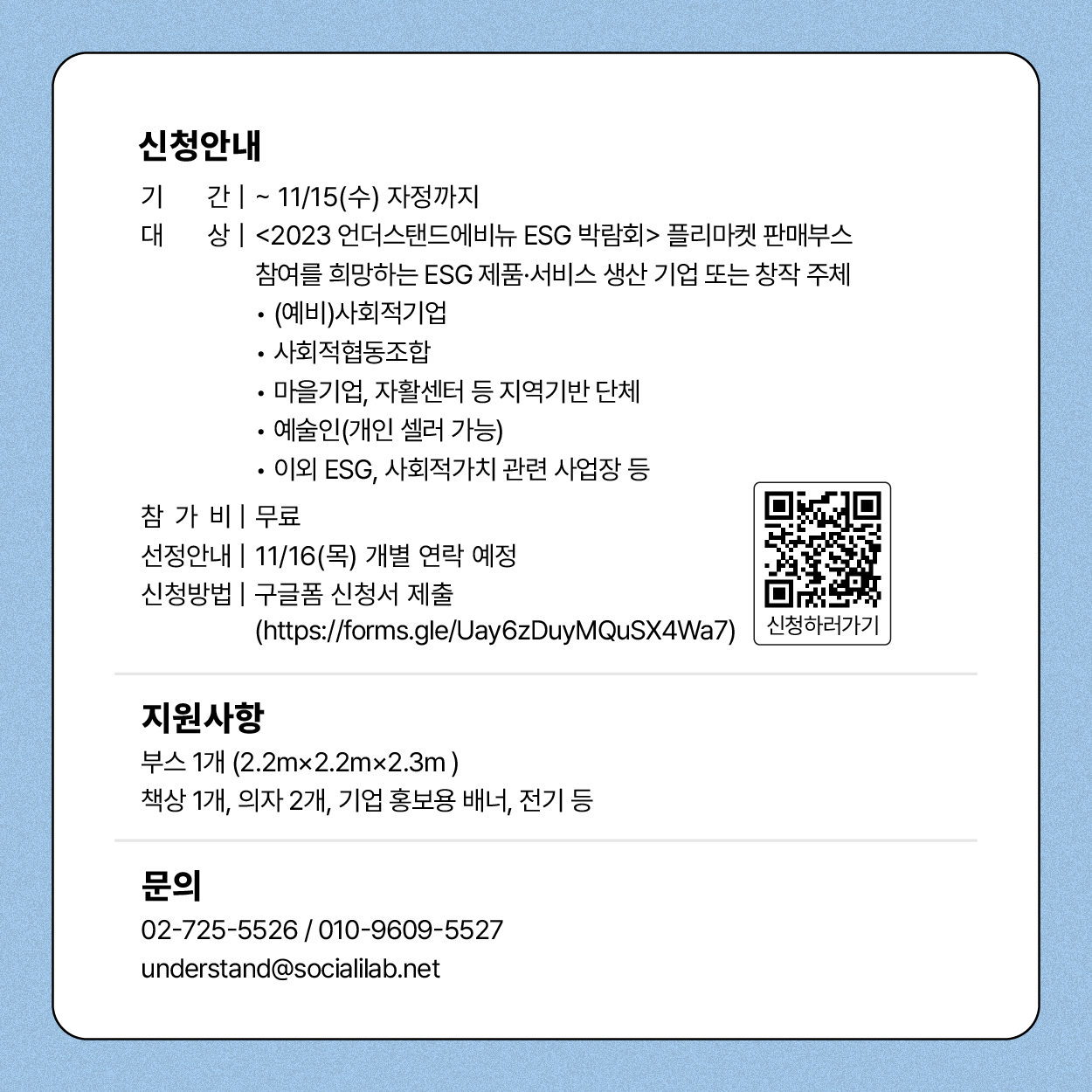 ☑️ 지원 사항: 부스 1개 (2.2m×2.2m×2.3m), 부스별 테이블1, 의자2, 홍보배너, 전기 등