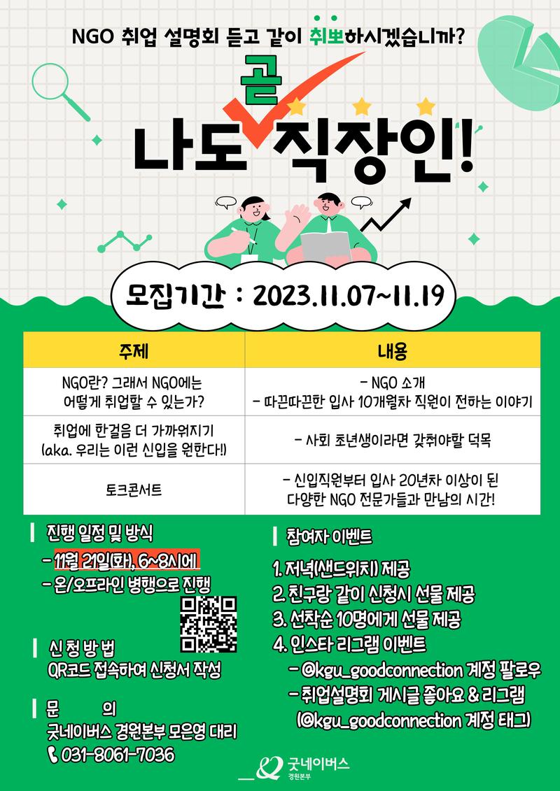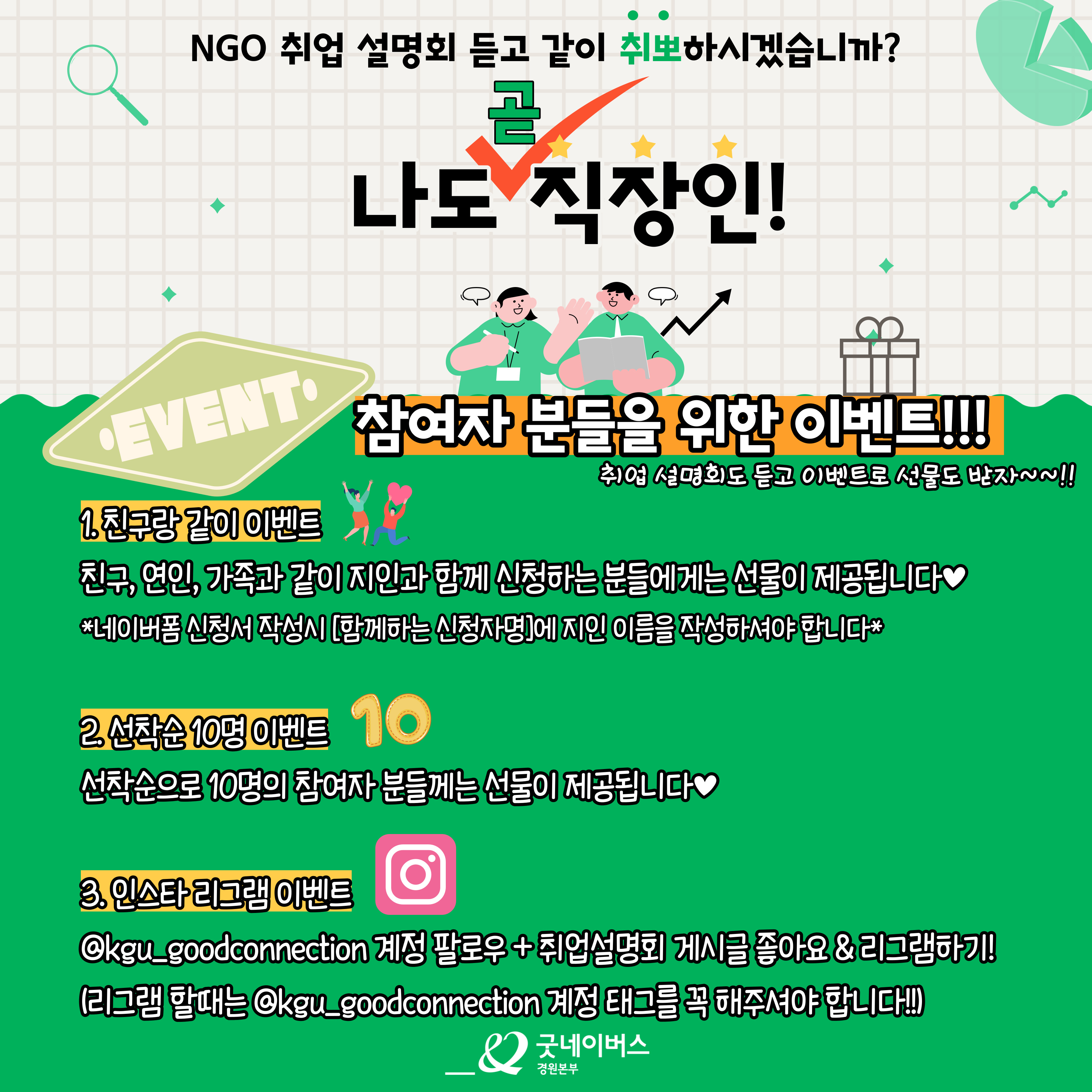 - @kgu_goodconnection 계정 팔로우 + 취업설명회 게시글 좋아요 & 리그램하기!