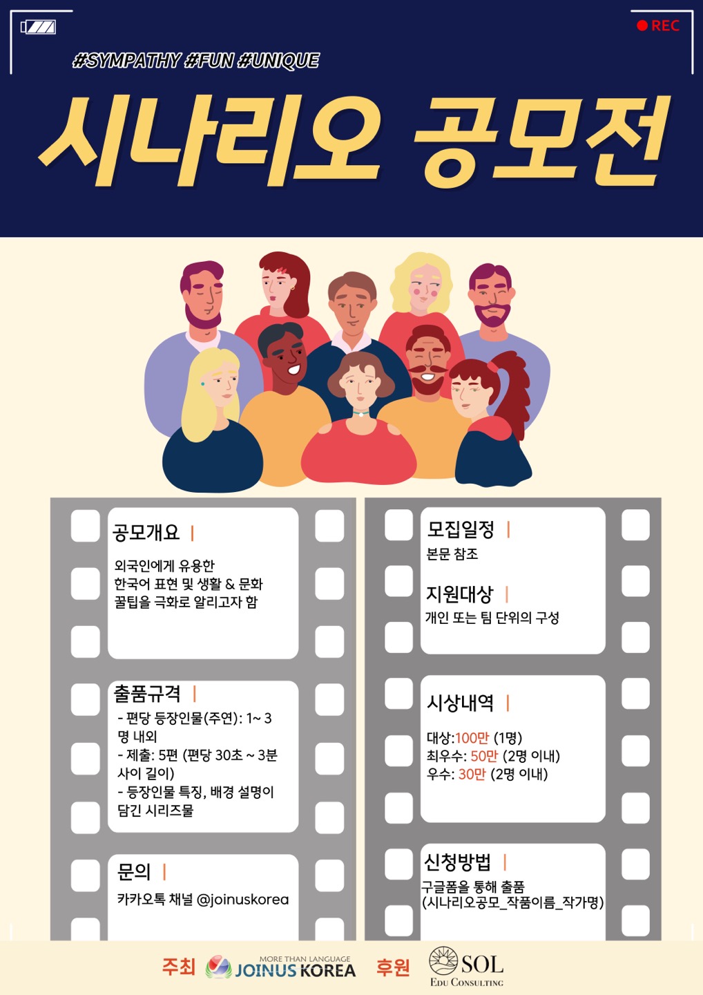 조인어스코리아가 영상을 통해 외국인에게 유용한 한국어 표현 및 생활 문화 등의 꿀팁을 재미있게 알리고자 시나리오 공모전을 개최합니다. 재미있고 유익한 영상을 만들 수 있는 기반을 만들어주실 시나리오 작가님들을 찾고 있습니다.