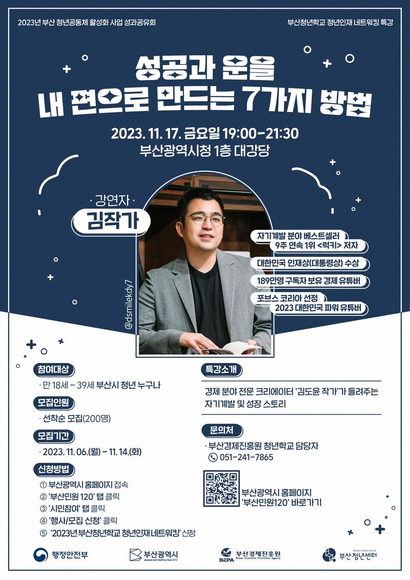 - 2부 : 유튜버 김작가의 "성공과 운을 내 편으로 만드는 7가지 방법" 초청특강