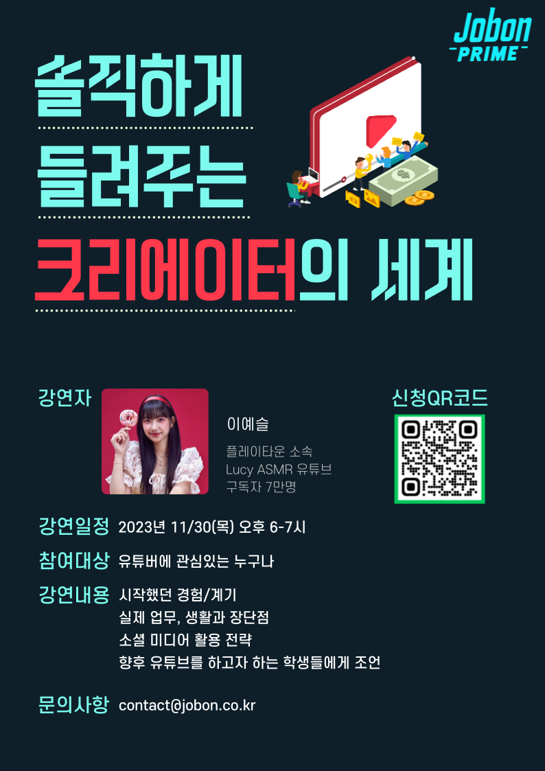 Lucy ASMR을 운영하시는 7만 유튜버 이예슬 멘토님께서 유튜브 크리에이터에 대한 자세한 이야기를 해주실 예정입니다!