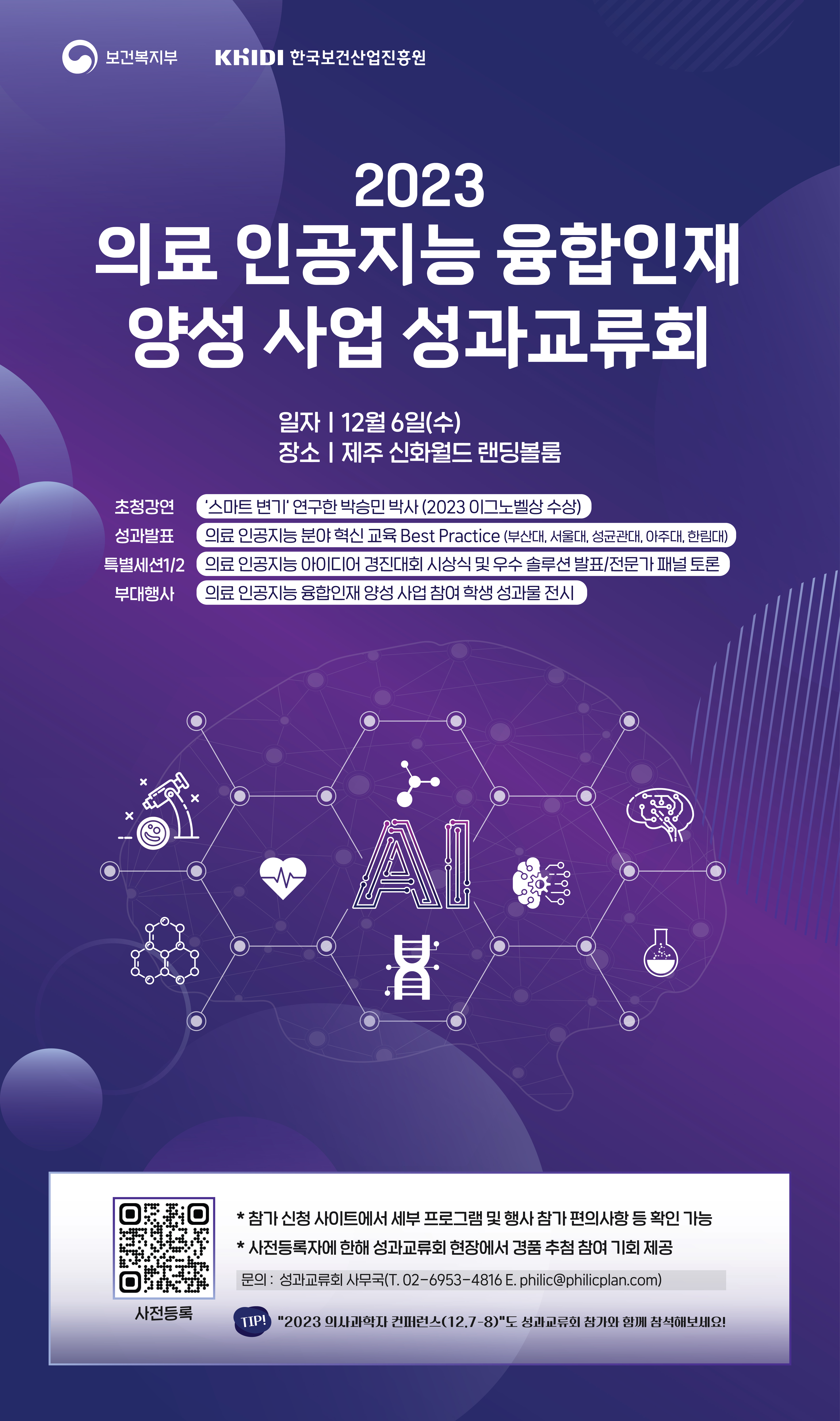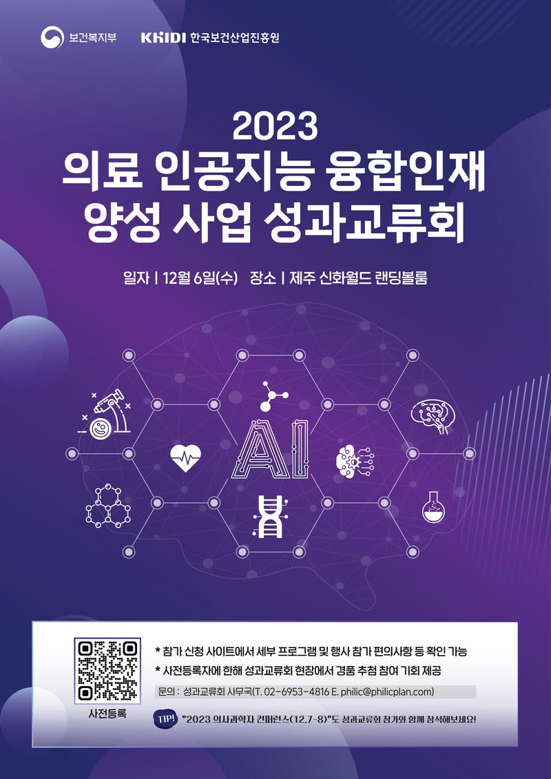 의료 인공지능 분야 융합 교육 과정 혁신 사례 및 우수 아이디어 발굴 사례를 공유하고, 의료 인공지능 융합인재 미래 수요 대응책을 모색하고자 다가오는 12월 6일 제주 신화월드에서 "2023 의료 인공지능 융합인재 양성 사업 성과교류회"를 개최하오니 많은 관심과 참여 바랍니다.
