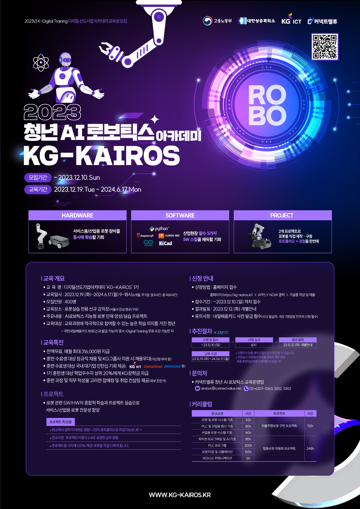 - 로봇 실습 장비(Robot Arm, TutleBot 등), 노트북 지원, 매월 훈련장려금 최대 316,000원 및 KG그룹 장학금 지원