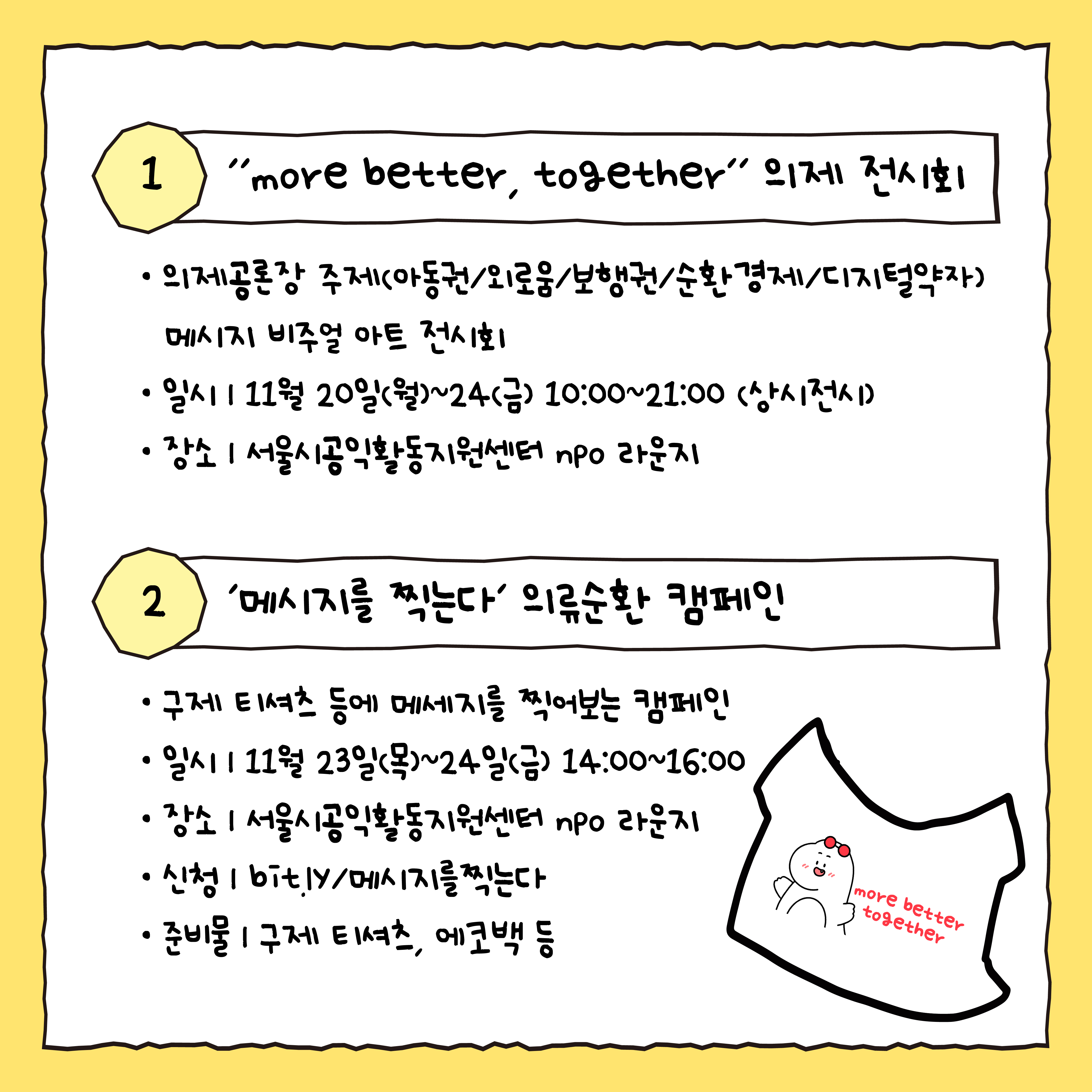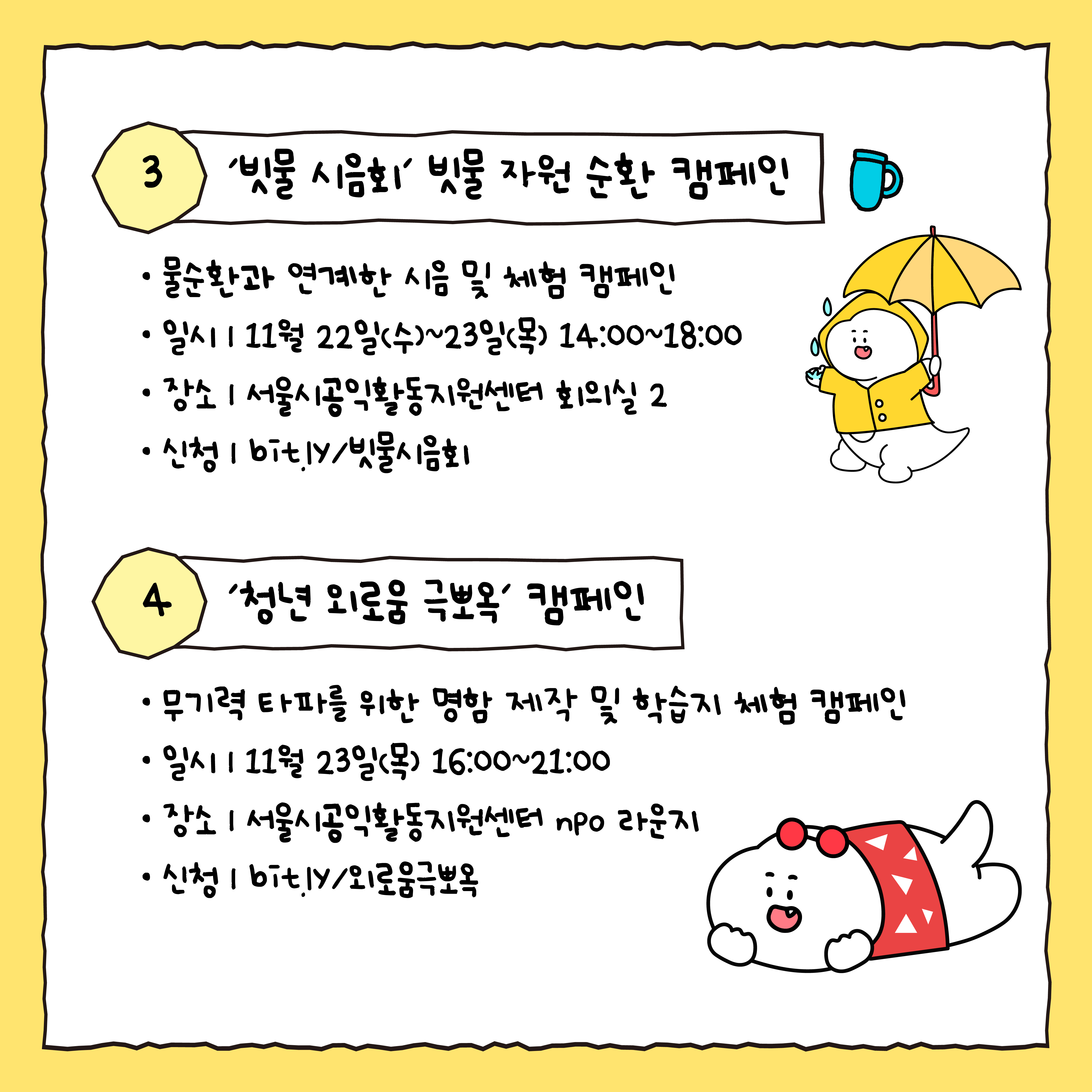 ✔️ 본 캠페인은 서울시공익활동지원센터가 주관하는 공익활동 주간 '연결의 감각' (2023.11.20.~11.24.) 행사 중 시민공익활동지원 플랫폼과 연계한 사업이며 기간 내 캠페인 참여 외 전시 관람 등이 가능합니다. (공익활동 네트워크 팝업존 '연결의 감각' 자세히 보기)