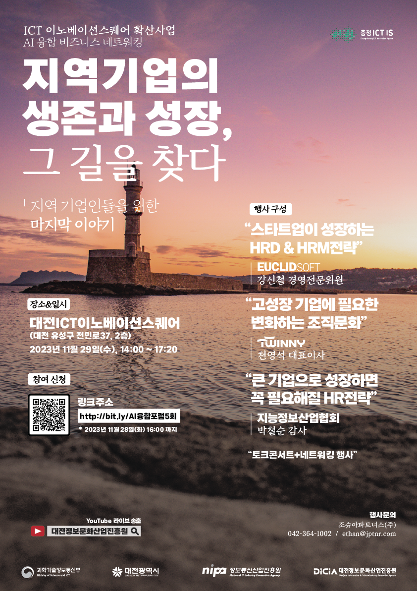 · 제 목 : <제5회> 지역기업의 생존과 성장, 그 길을 찾다 · 목 적 : 혁신포럼을 통해 지역 소재 기업이 당면한 문제점 공유 및 해결 방법 도출 · 일 시 : 2023년 11월 29일 (수) , 14:00 ~ 17:20 · 장 소 : 대전ICT이노베이션스퀘어 2층 · 주 소 : 대전 유성구 전민로 37, 2층(문지동, 대전세종연구원 건물) · 대 상 : 대전, 충청 지역에 소재한 또는 이전 예정인 AI 융합기업 및 유관기관 관계자 40~50인 |
