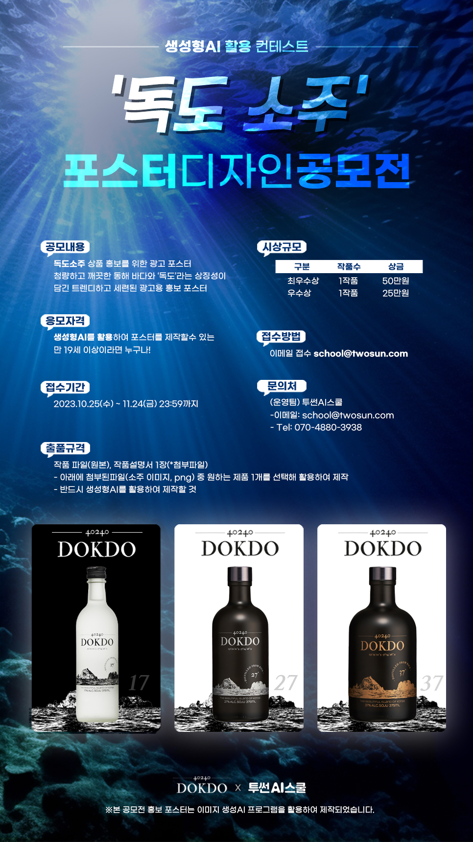 - 수상작품에 대한 저작권(저작인격권과 저작재산권)은 수상자에게 있으나, 수상자가 본 공모전에서 상금 및 부상, 상장을 지급받은 경우 독도 소주 및 투썬AI스쿨이 정당한 대가를 지급하고 수상작에 대한 저작재산권을 취득한 것으로 간주합니다. 따라서 독도소주 및 투썬AI스쿨이 수상작을 홍보 목적으로 자유롭게 활용(제작, 복제, 배포 등) 할 수 있으며, 목적의 범위 안에서 수상작의 전체나 일부를 변경하여 이용할 수 있습니다.