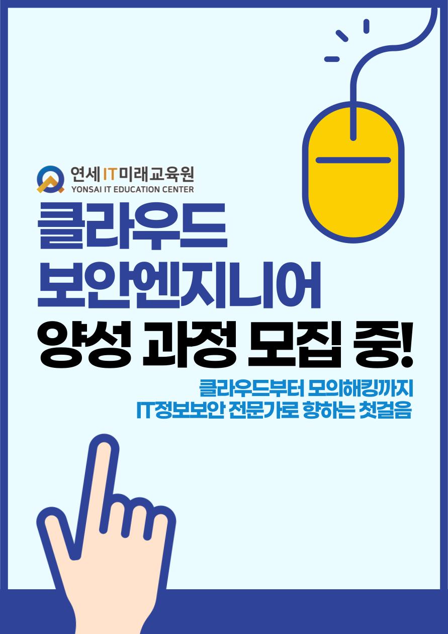 #클라우드보안 #네트워크 #화이트해커 #IT정보보안 #정보보안 #코딩 #클라우드보안국비지원 #국비지원컴퓨터학원 #수원컴퓨터학원 #IT국비지원 #모의해킹 #네트워크보호 #사이버공격 #보안교육 #코딩학원 #KDT #내일배움카드 #연세IT미래교육원 #국비교육 #취업준비 #국비지원코딩