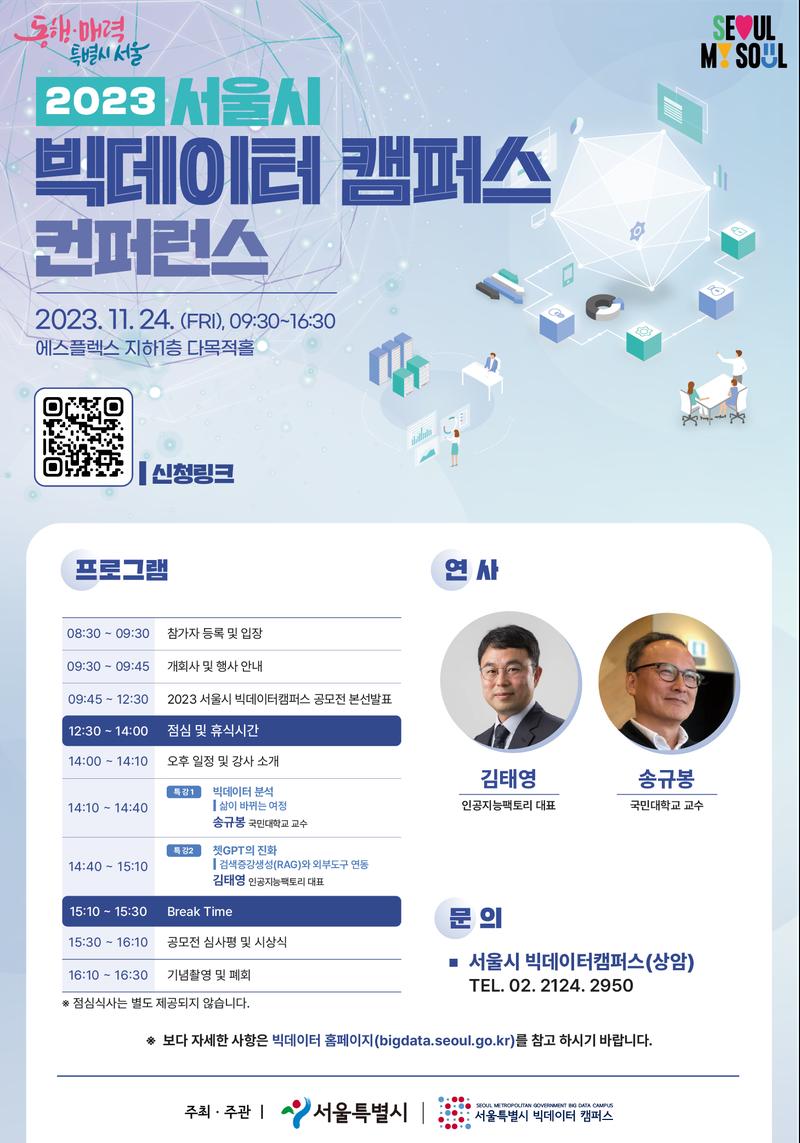 본 행사는 오전과 오후로 나누어 진행될 예정이며 2023년 빅데이터캠퍼스 공모전 최종 발표 및 본선심사와 빅데이터 현업 전문가 2분(송규봉 국민대학교 교수, 인공지능팩토리 김태영 대표)의 강연이 진행될 예정이오니 많은 관심과 참여 바랍니다.참가 희망시 아래 구글폼에서 사전참가신청 바랍니다●행사명: 2023 서울시 빅데이터캠퍼스 컨퍼런스 ●일시: 2023년 11월 24일(금) 09시30분 \~16시30분 ●장소: 서울시 상암동 에스플렉스센터, 3D 영화관 (지하1층) ●주최·주관: 서울특별시