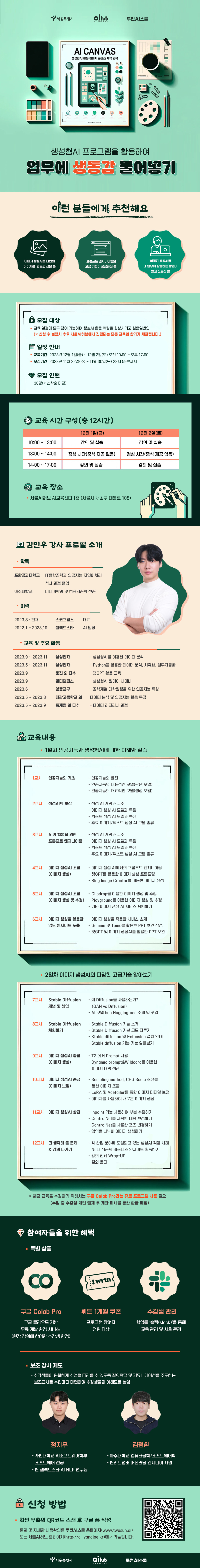 💡 서울AI허브의 2023 AI아카데미 <AI 캔버스: 생성형AI 활용 이미지 콘텐츠 제작 교육>이란?수강생이 이미지 생성AI에 대한 기본적인 지식과 프로그램 사용 방법을 학습하고