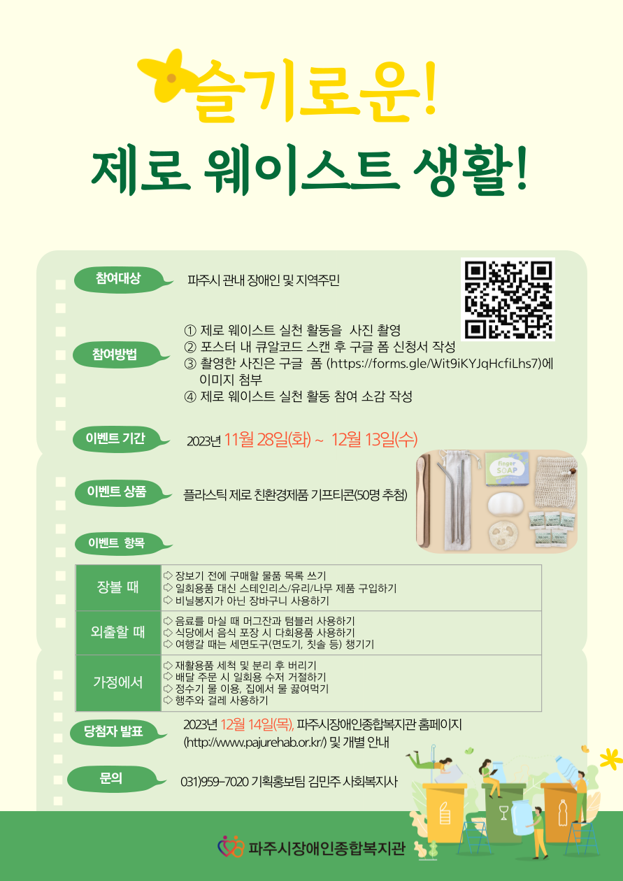 파주시장애인종합복지관에서는 ESG 경영실천사업으로 지구온난화 대응을 위해 일회용품 사용을 줄이고 재활용이 가능한 제품을 사용하여 쓰레기 배출을 예방하는 '슬기로운 제로 웨이스트 생활' 이벤트가 11/28(화)~ 12/13(수)까지 진행됩니다. 많은 참여 바랍니다!!