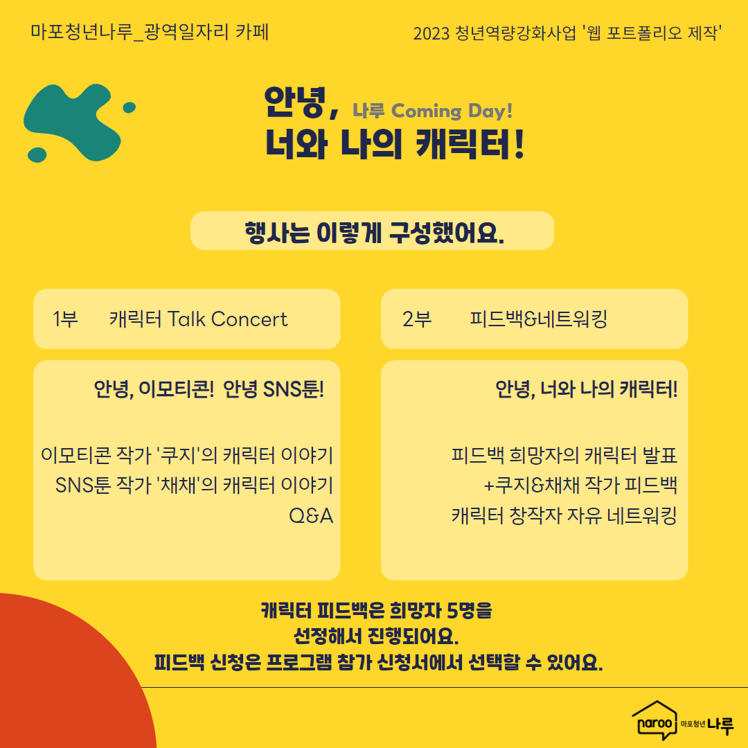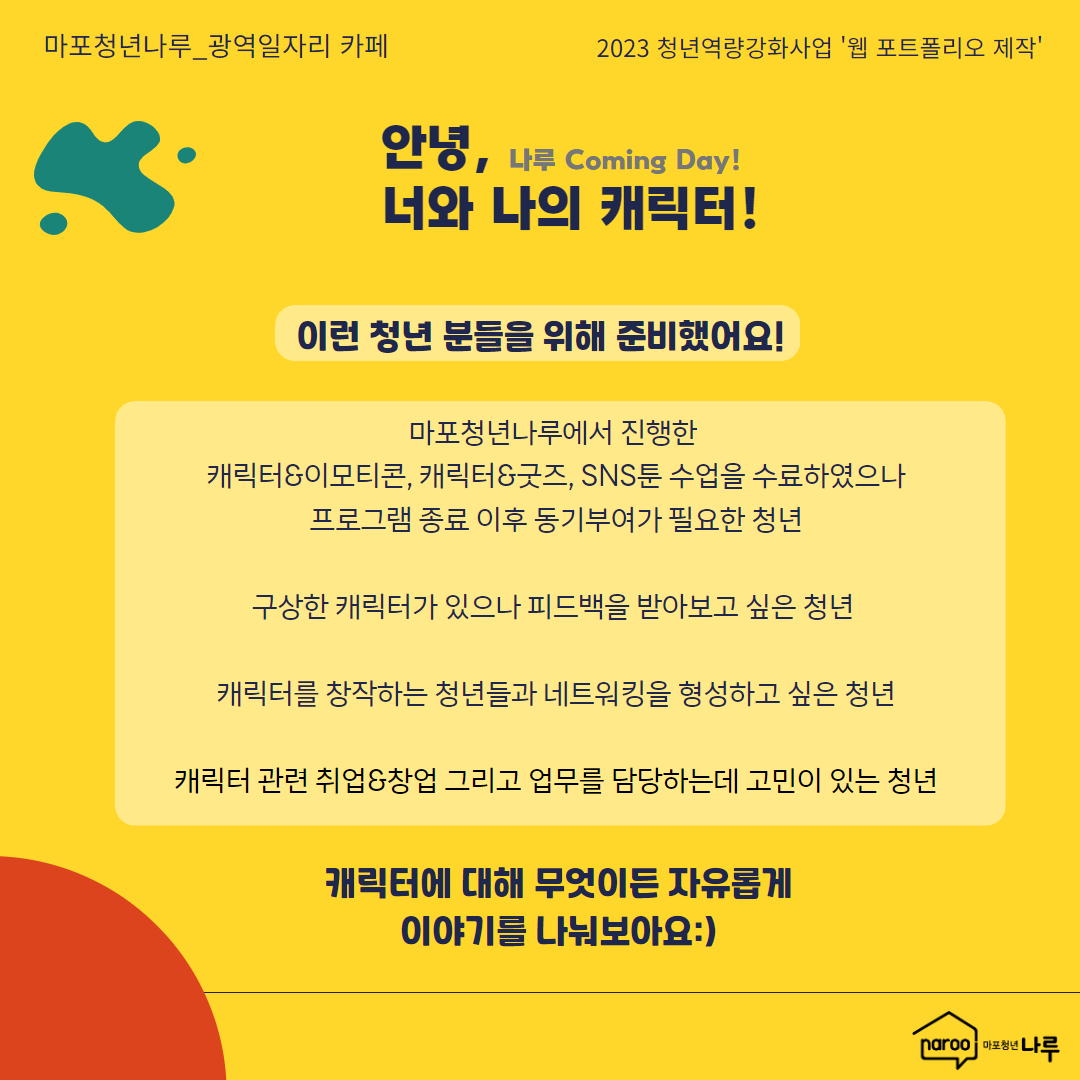 이번 프로그램은 그 동안 마포청년나루에서 캐릭터 관련 프로그램을 수료한 후 조금 더 동기부여를 얻고 싶은 청년분들과 기존의 구상하였던 캐릭터가 있으나 좀 더 나은 캐릭터에 대해 고민이 있는 청년 분들을 위해 캐릭터 작가들의 토크콘서트와 Q&A, 발표&피드백, 캐릭터 창작 청년들의 네트워킹까지 한 번에 할 수 있는 자리를 마련하기 위해 <나루 Coming Day!, 너와 나의 캐릭터!> 프로그램을 기획하였습니다.