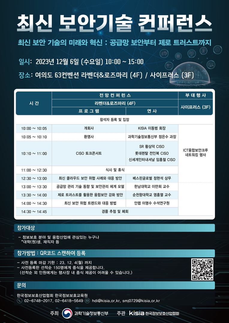 제로트러스트, 공급망 보안 등 산업계 최신 보안 이슈들을 공유할 예정이오니, 여러분들의 많은 참석 부탁드립니다.