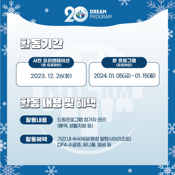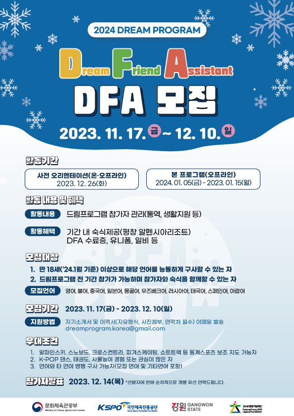 드림프로그램 참가자들 대상으로 함께 통역과 국가별 생활을 함께 해 줄 DFA를 모집합니다.