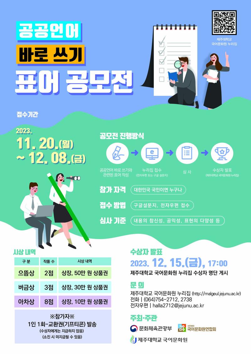 제주대학교 국어문화원에서는 대한민국 일반 국민을 대상으로 공공언어 바로 쓰기 표어 공모전을 개최합니다. 이 공모전은 공공언어의 ‘공공성’과 ‘소통성’에 대한 공공기관과 국민의 인식을 높이고자 하는데 목적을 두고 있습니다. 시민 여러분의 많은 응모를 기다립니다.