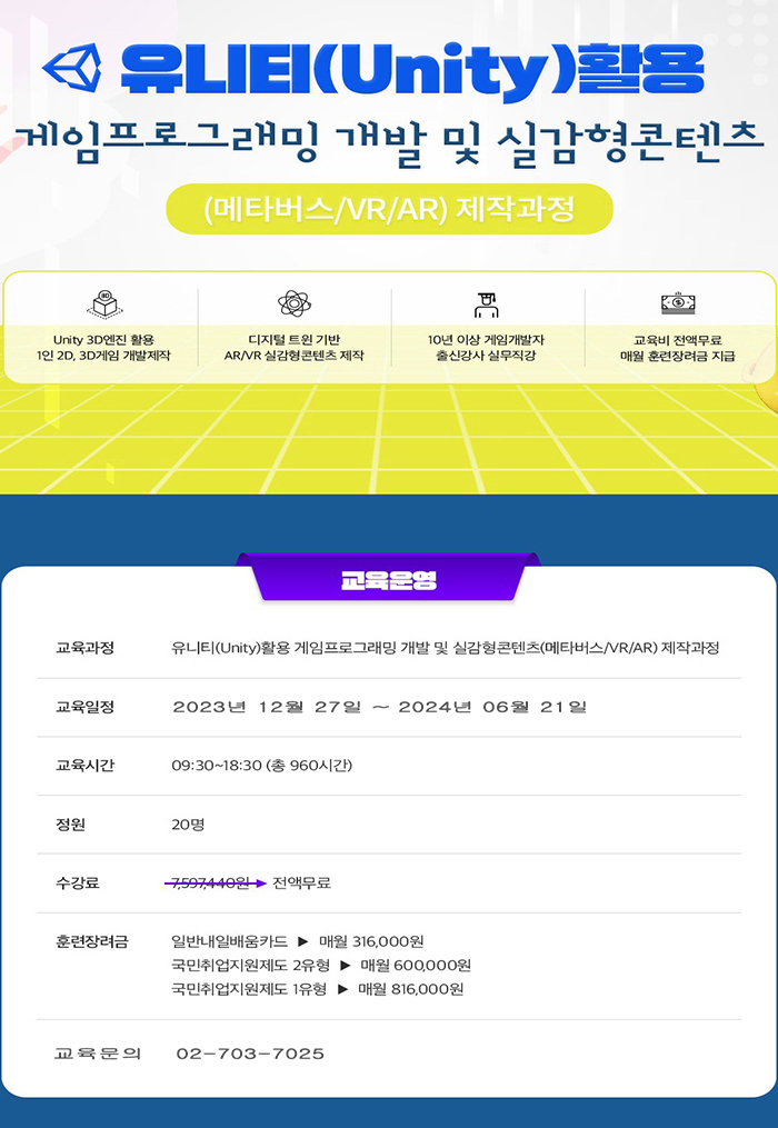 훈련과정 - 유니티(Unity) 활용 게임프로그래밍 개발 및 실감형콘텐츠(메타버스 or VR or AR) 제작과정
