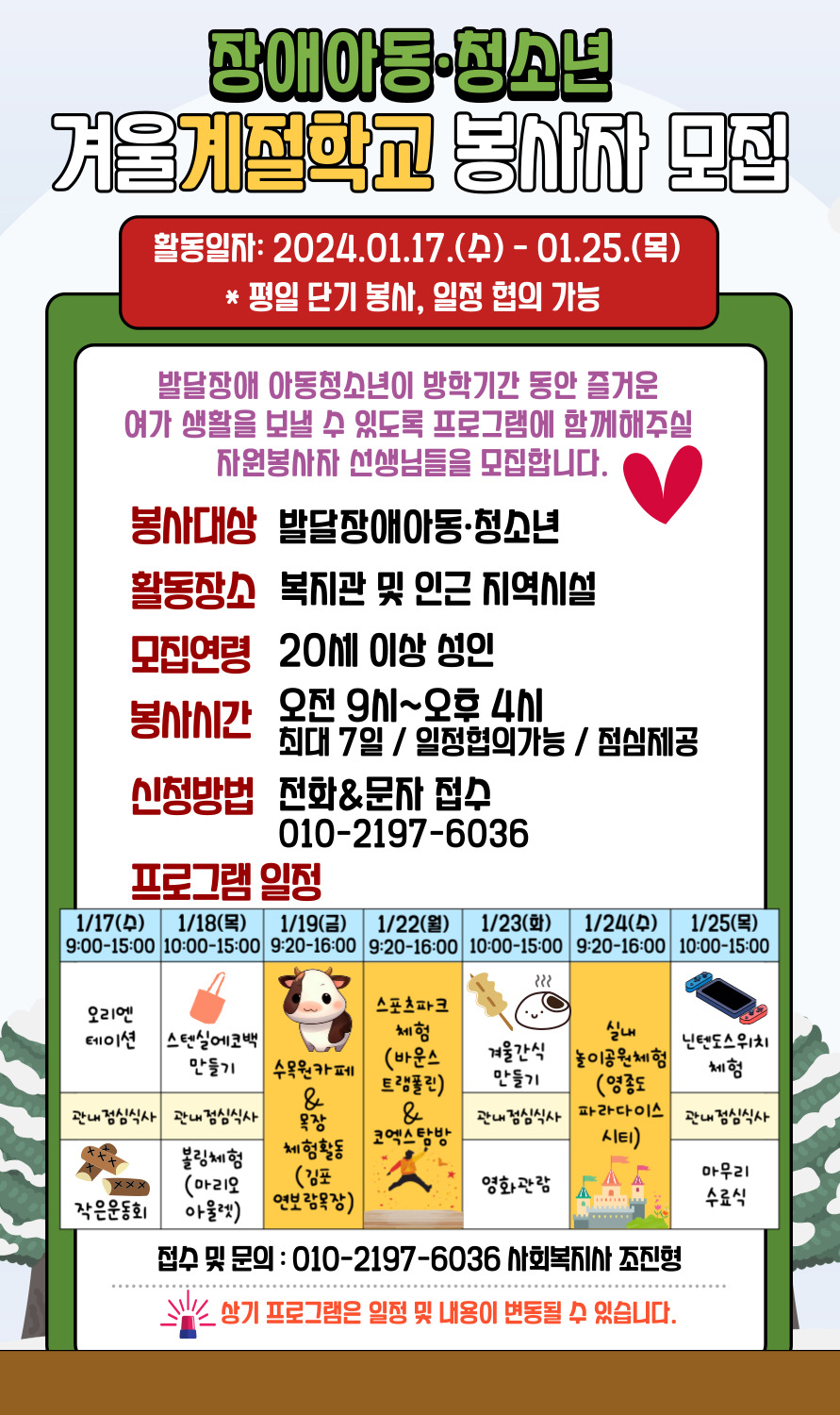봉사일자: 2024-01-17(수) ~ 2024-01-25(목)(주말 제외, 일정협의 가능)