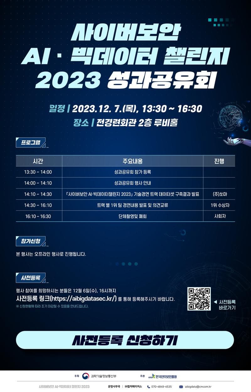 ๐ฅ[๊ณผํ๊ธฐ์ ์ ๋ณดํต์ ๋ถ ์ฃผ์ต/ํ๊ตญ์ธํฐ๋ท์งํฅ์ ์ฃผ๊ด] ์ฌ์ด๋ฒ๋ณด์ AI ๋น ๋ฐ์ดํฐ ์ฑ๋ฆฐ์ง 2023 ์ฑ๊ณผ๊ณต์ ํ ์ฐธ๊ฐ์ ์ฒญ ๐ฅ