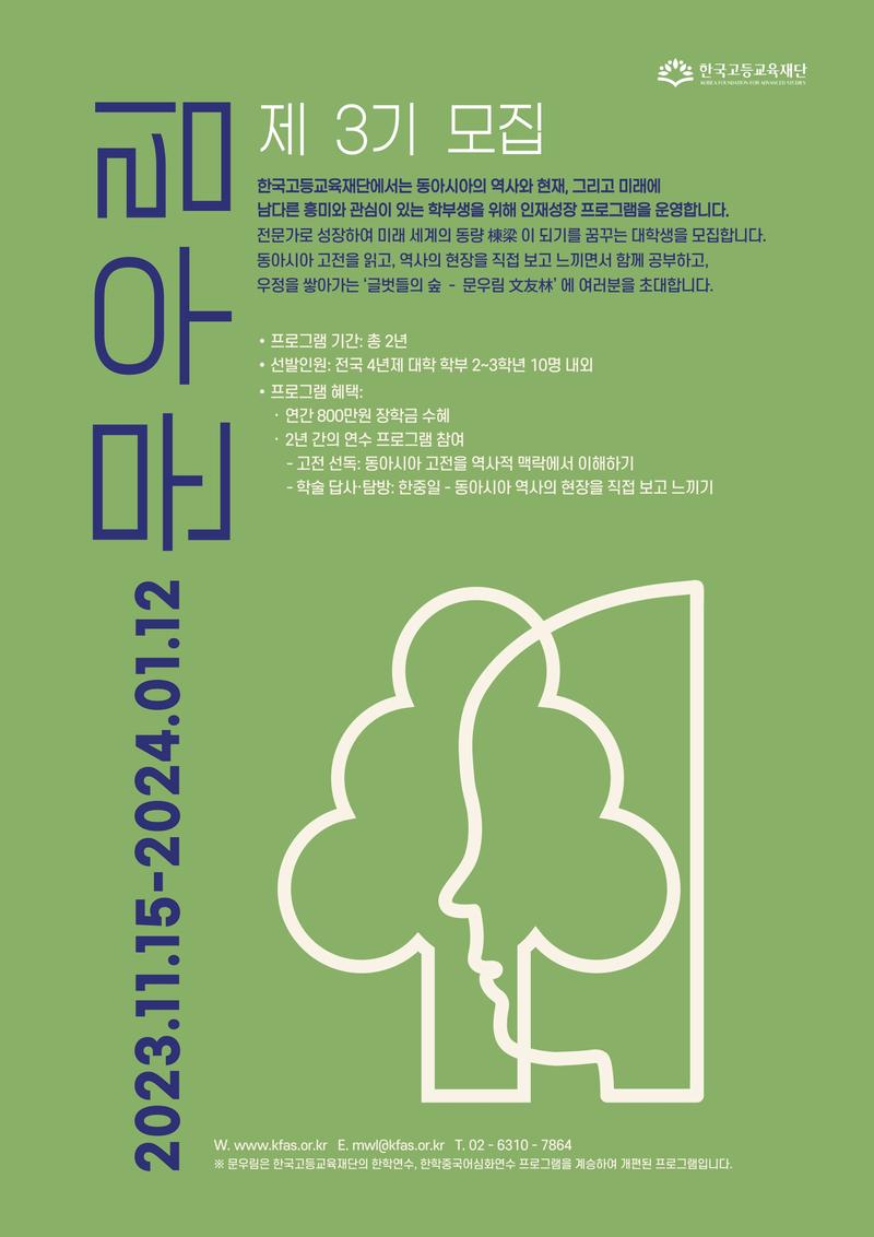 한국고등교육재단에서 제3기 문우림 장학생을 아래와 같이 선발하오니 관심 있는 학생들의 지원 바랍니다.