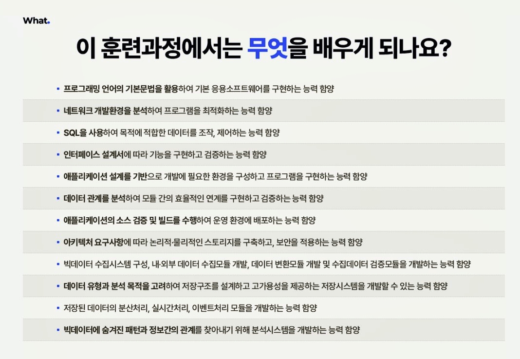 - 저장된 데이터의 분산처리, 실시간처리, 이벤트처리 모듈을 개발하는 능력 함양
