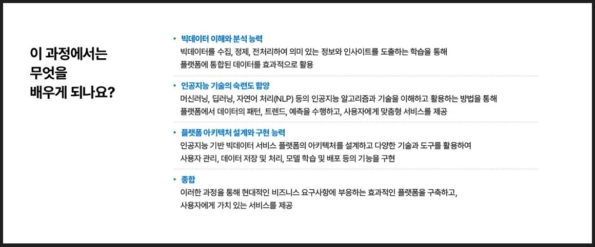 - 빅데이터를 수집, 정제, 전처리하여 의미있는 정보와 인사이트를 도출하는 학습을 통해 플랫폼에 통합된 데이터를 효과적으로 활용