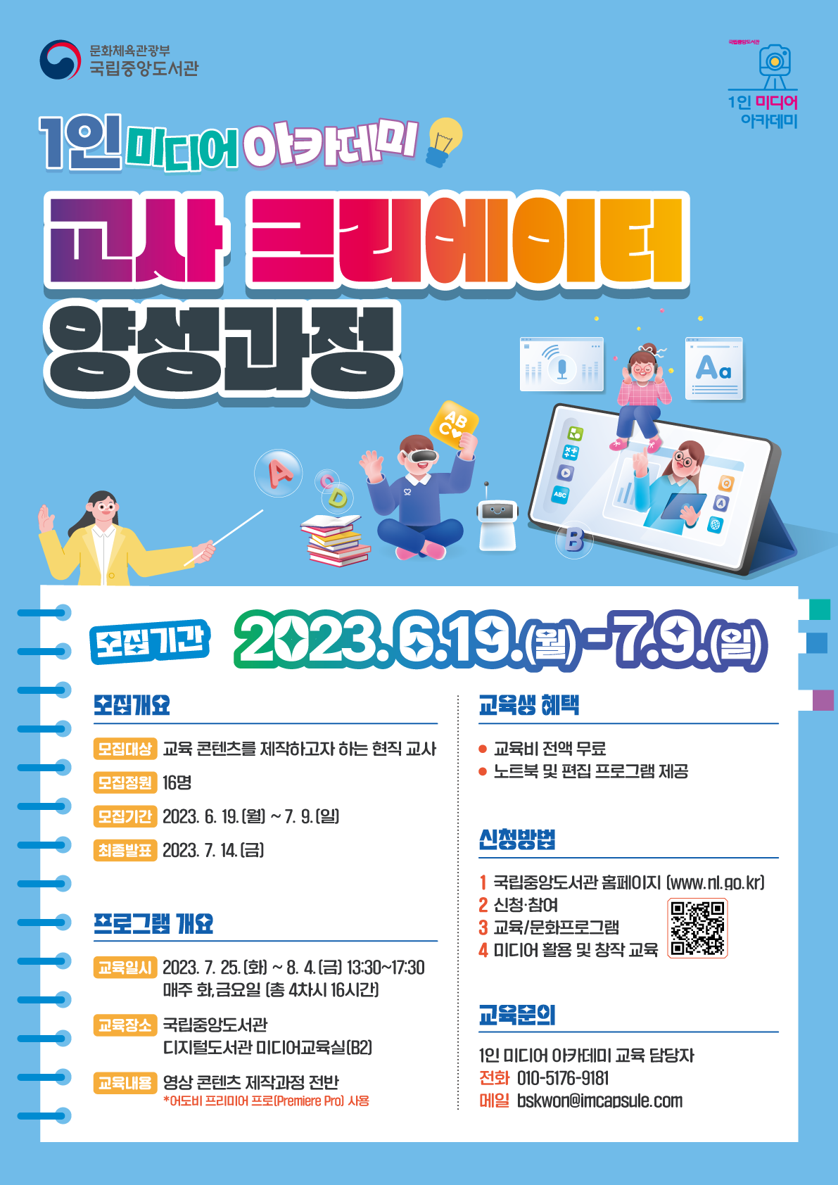 국립중앙도서관에서 재능 있는 크리에이터들을 발굴하고자 ‘2023 1인 미디어 아카데미’를 운영합니다.