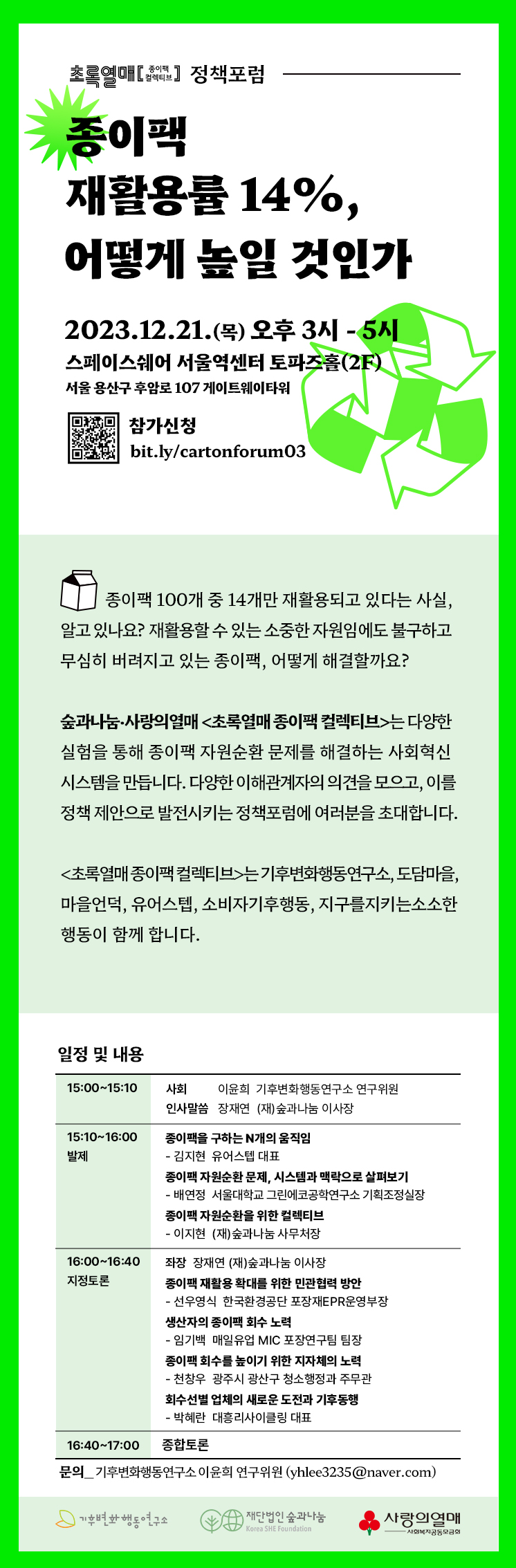 [숲과나눔] 초록열매 종이팩 컬렉티브 정책포럼 <종이팩 재활용률 14%, 어떻게 높일 것인가> (12/21)