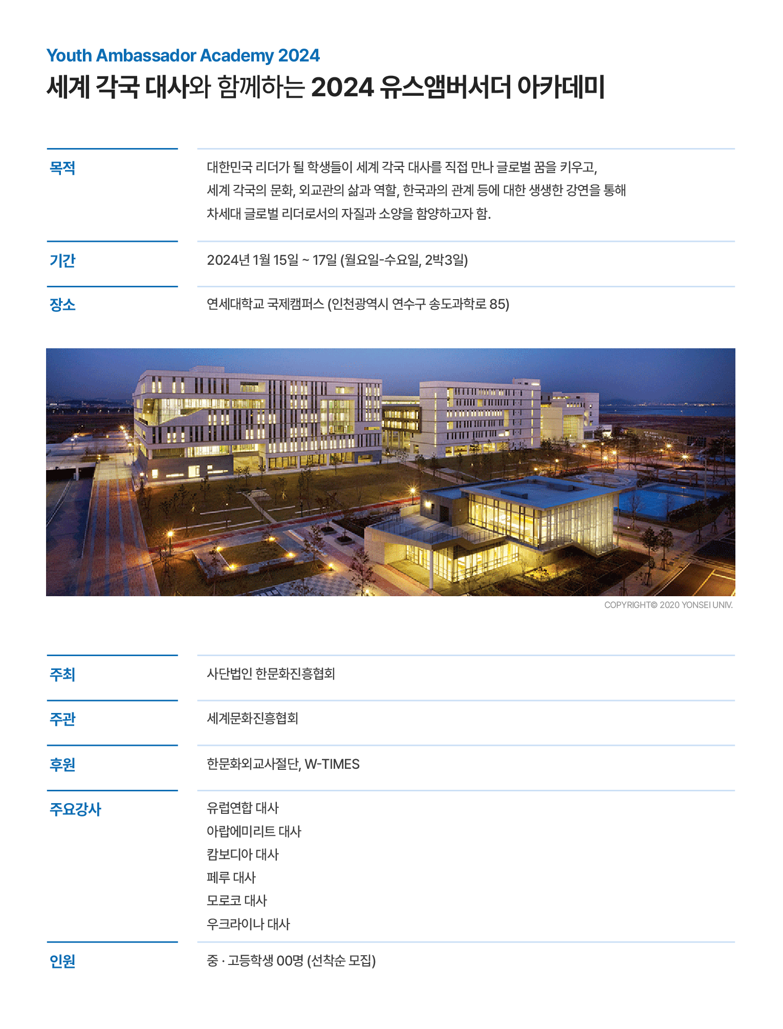 청소년 시기에 만나는 롤모델은 인생의 터닝포인트가 될 수 있는 매우 중요한 역할을 합니다. 세계 각국의 대사를 만나며 교류하는 시간은 여러분에게 글로벌 마인드와 비전을 심어줄 것입니다.