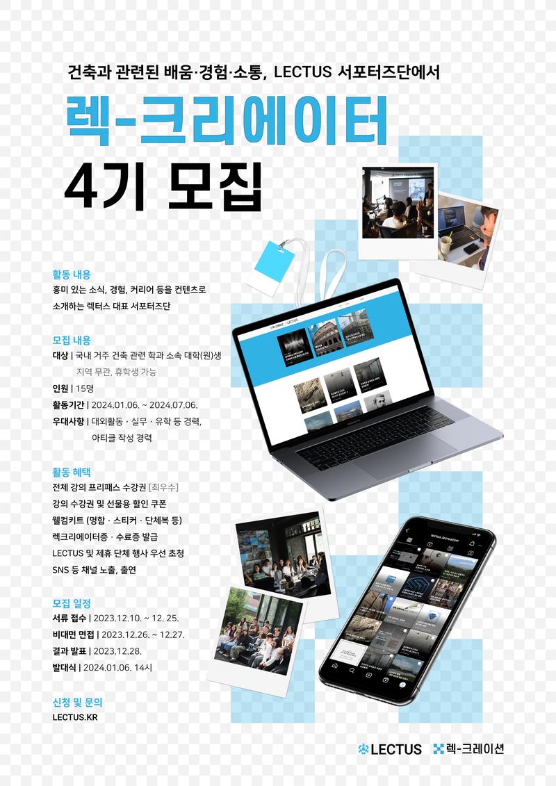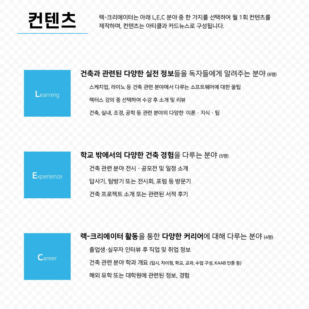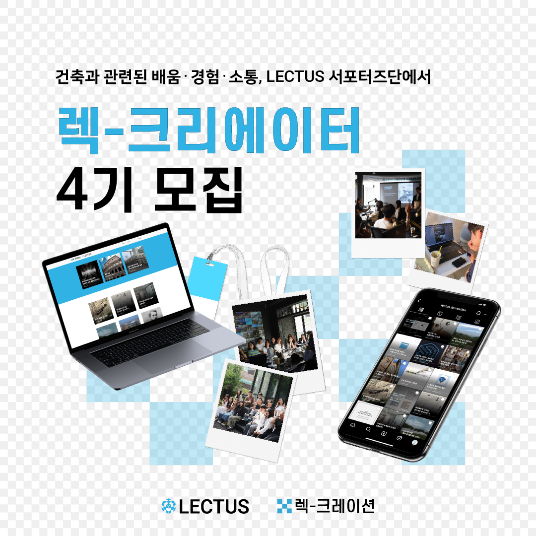 LECTUS는 지난 2020년 부터 건축 관련 분야 학생 분들의 창작활동지원을 위해 [렉-크레이션]이라는 이름으로 각종 지원활동을 이어오고 있습니다.