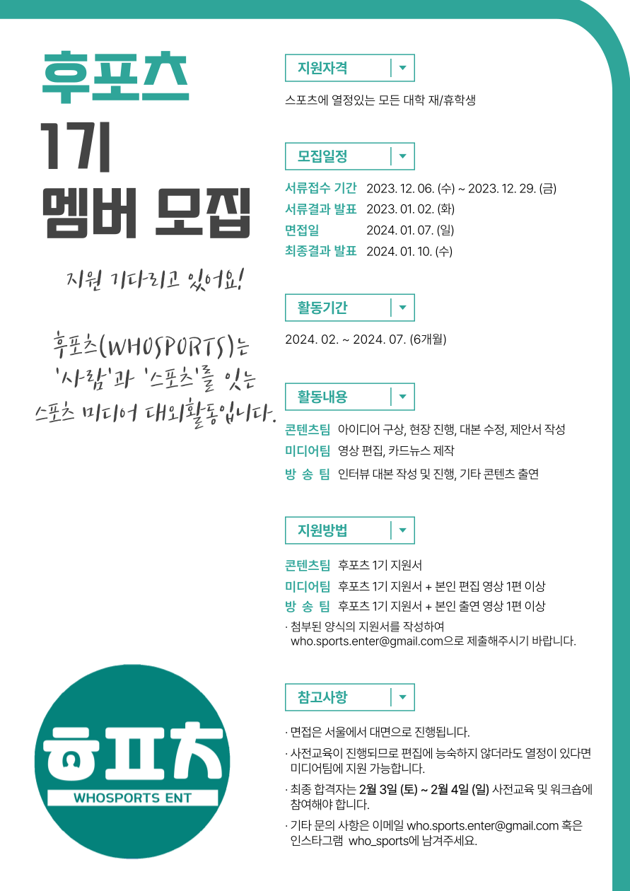 - 방송팀: 후포츠 1기 지원서 + 본인 출연 영상 1편 이상