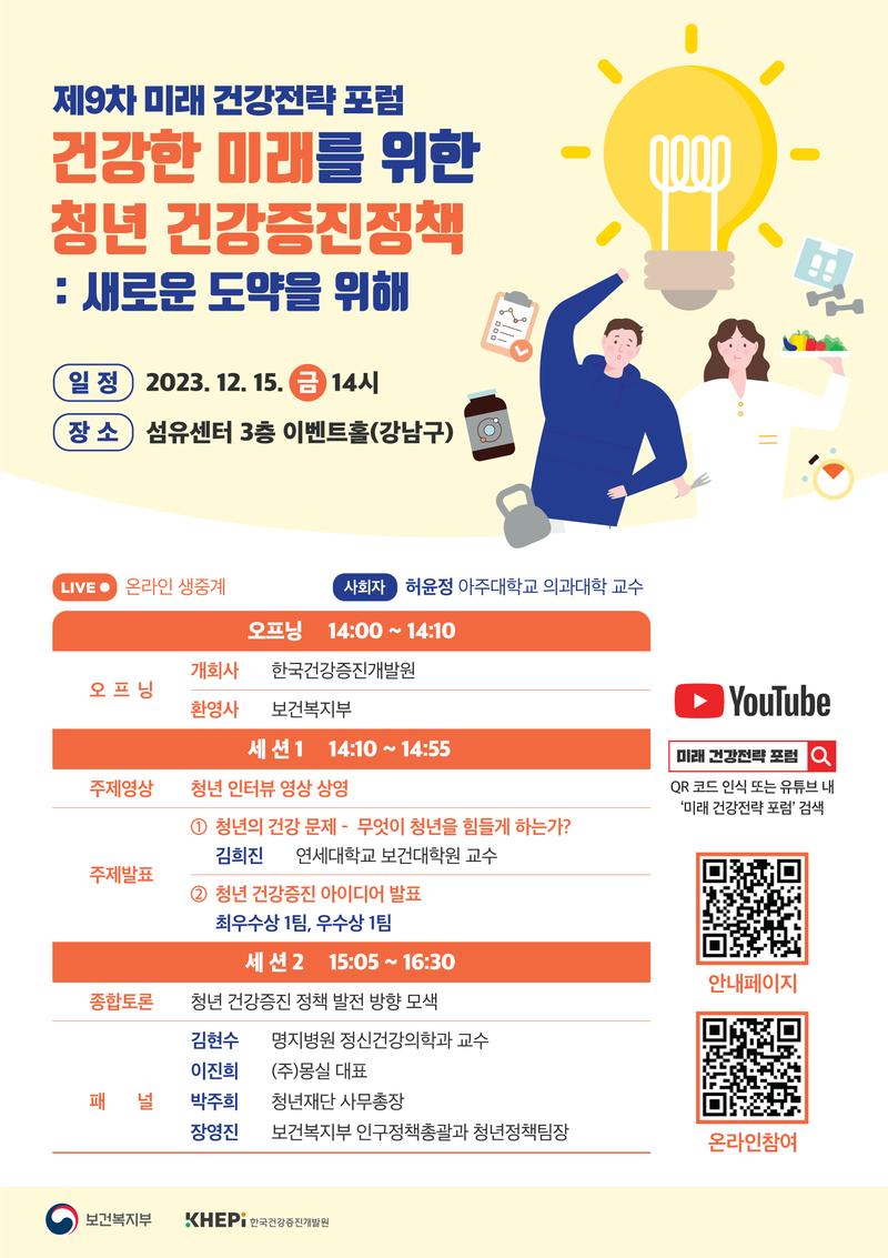 미래 지향적인 청년 건강정책 방향을 모색하는 시간을 마련하였습니다. 더불어 한국건강증진개발원 실시간 유튜브 채널을 통해 채팅창으로 누구나 자유롭게 의견을 나눌 수 있으며 사전등록 인증 및 실시간 참여 이벤트 등 다양한 이벤트를 준비했으니 많은 관심과 참여 부탁드립니다.