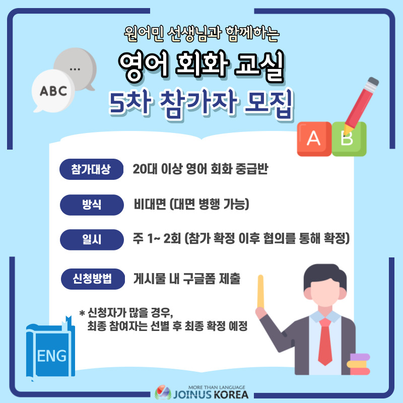 - 참가 대상: 20대 이상의 영어 회화 중급 (4~10명 내외 선발, 추후 수요에 따라 분반 확대 예정)