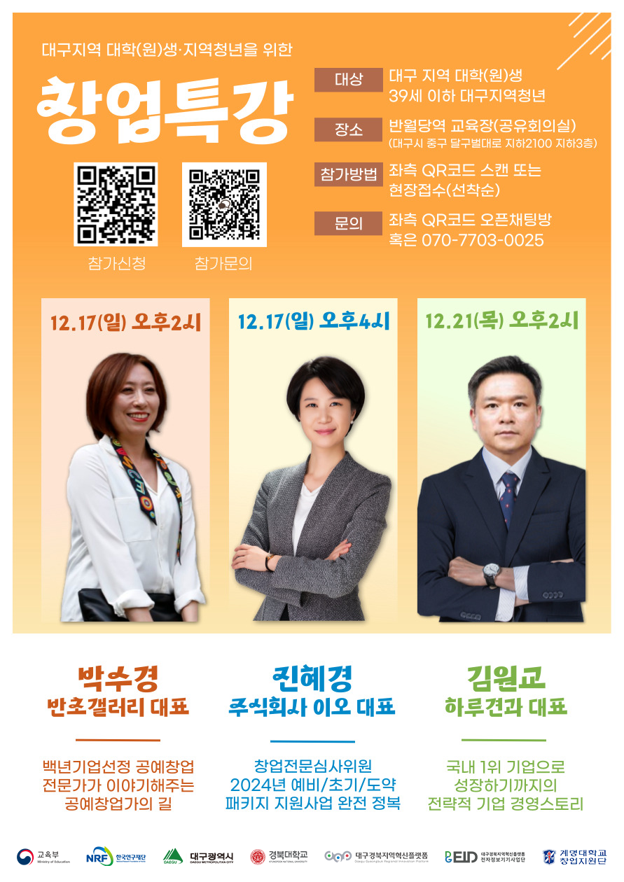 - 행사명: 대구지역 대학(원)생·지역청년을 위한 창업특강 "그렇게 우리는 창업가가 되었다"
