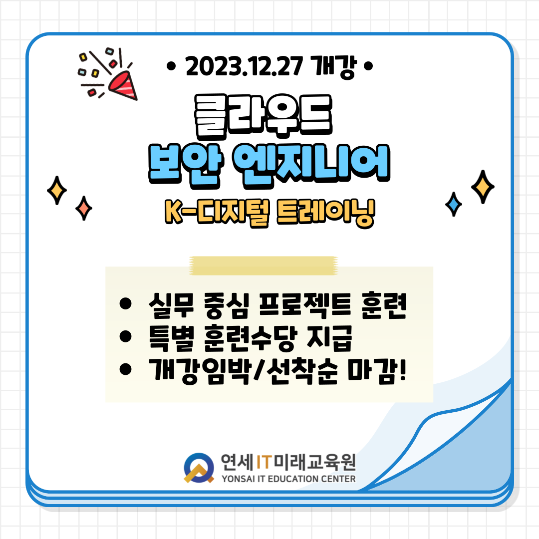 #클라우드보안 #네트워크 #화이트해커 #IT정보보안 #정보보안 #코딩 #클라우드보안국비지원 #국비지원컴퓨터학원 #수원컴퓨터학원 #IT국비지원 #모의해킹 #네트워크보호 #사이버공격 #보안교육 #코딩학원 #KDT #내일배움카드 #연세IT미래교육원 #국비교육 #취업준비 #정보처리기사 #보안 #해킹 #리눅스 #화이트해커