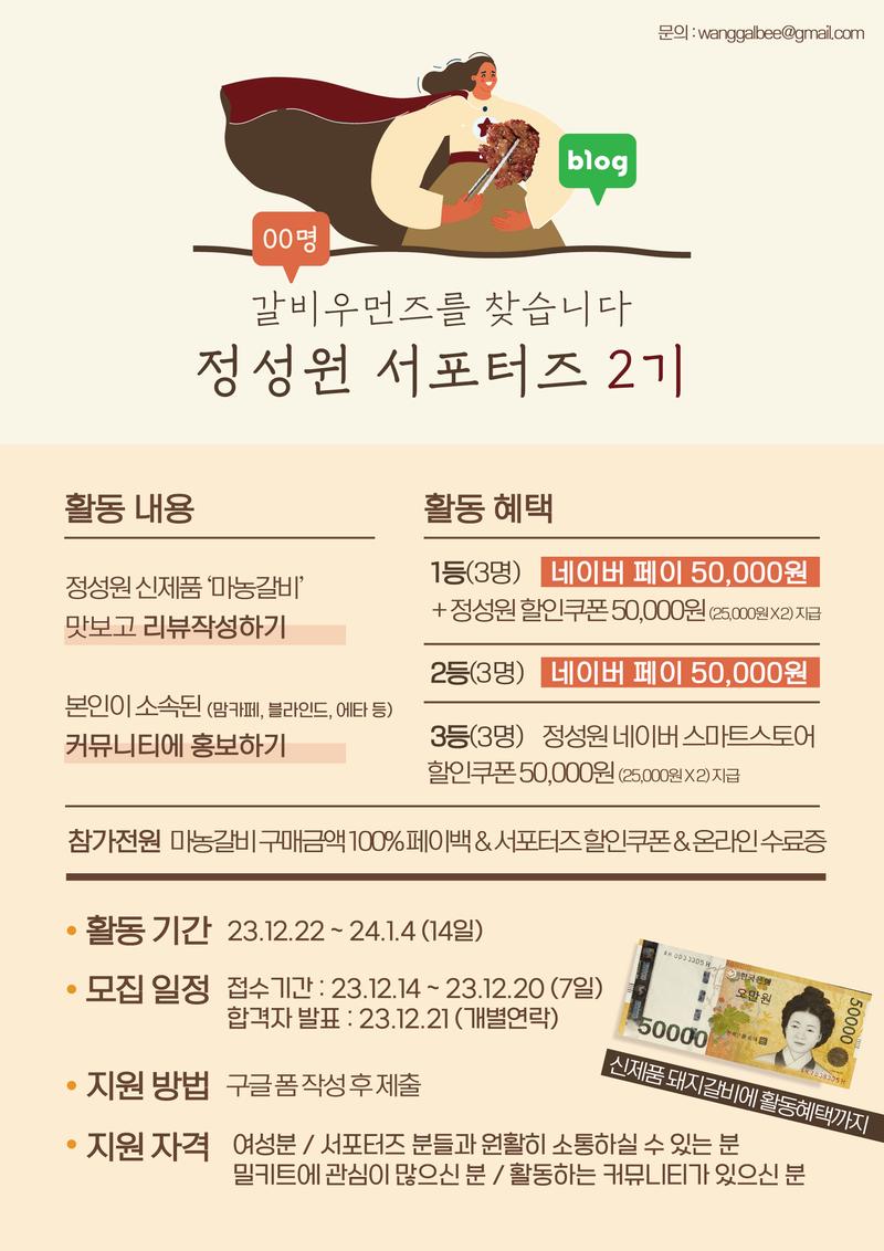 이번에 신제품 출시를 맞이하여 ‘정성원 서포터즈 2기(갈비우먼즈)’를 모집하게 되었습니다.
