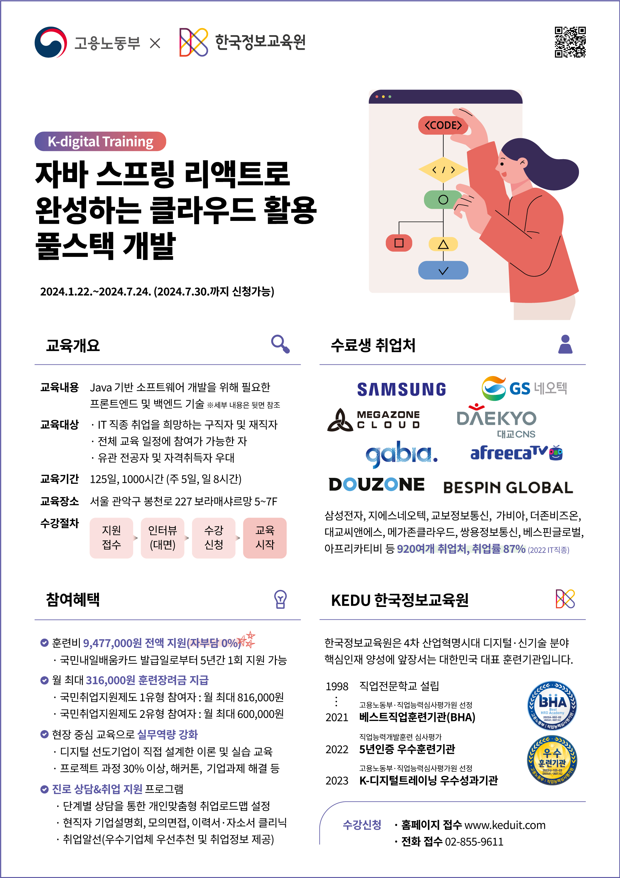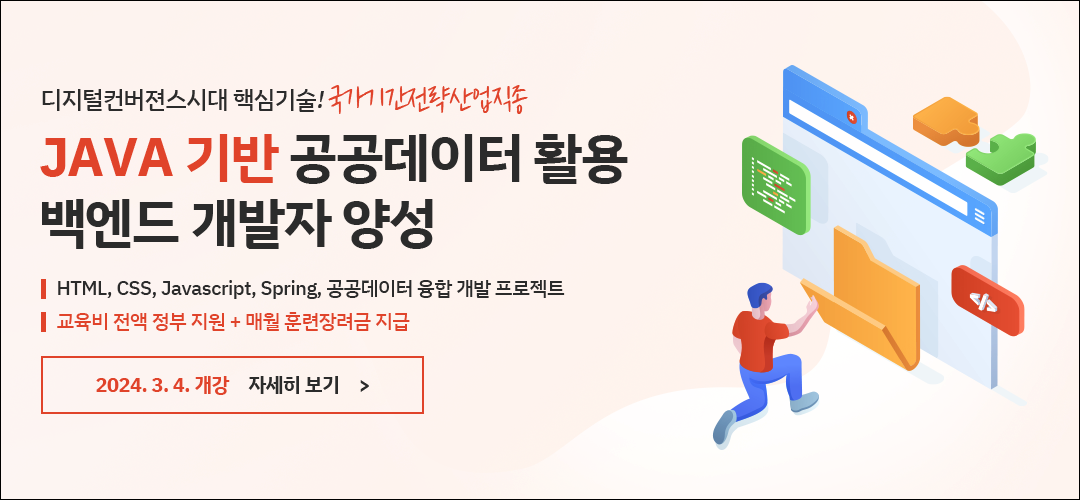 📢 프론트엔드 및 백엔드 기술에 대해 학습하고, 논리력 및 실무능력을 학습하는 취업에 강한 풀스택 개발자 교육이 2024.01.22(월) ~ 2024.07.24(수)에 진행됩니다.
