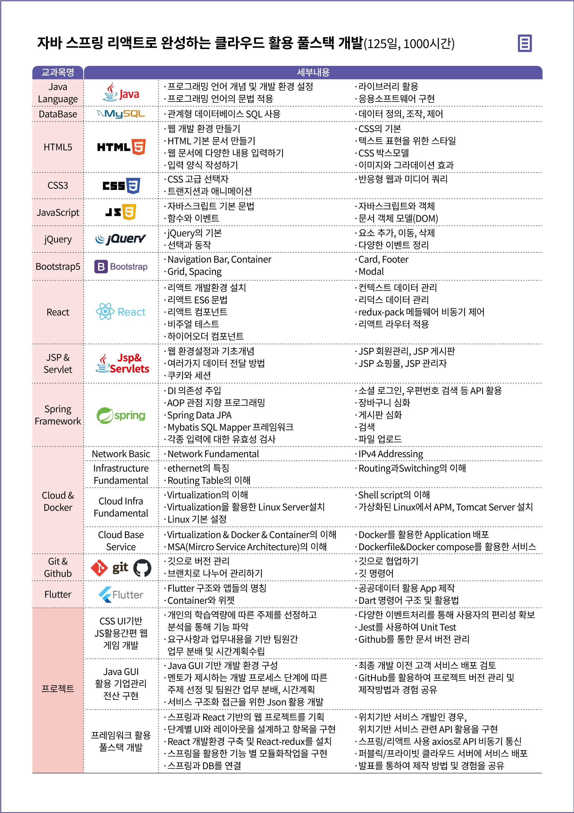 약 6개월간 주 5일 실무형 교육으로 창의적 문제 해결을 위한 실전 코딩 스터디를 수행하며 웹 개발 기초부터 프론트엔드, 백엔드, 개발 서버 구축 등 풀스택 개발자에게 필요한 기술에 대한 학습하는 실무 프로젝트를 통해 남다른 경쟁력을 얻을 수 있습니다.