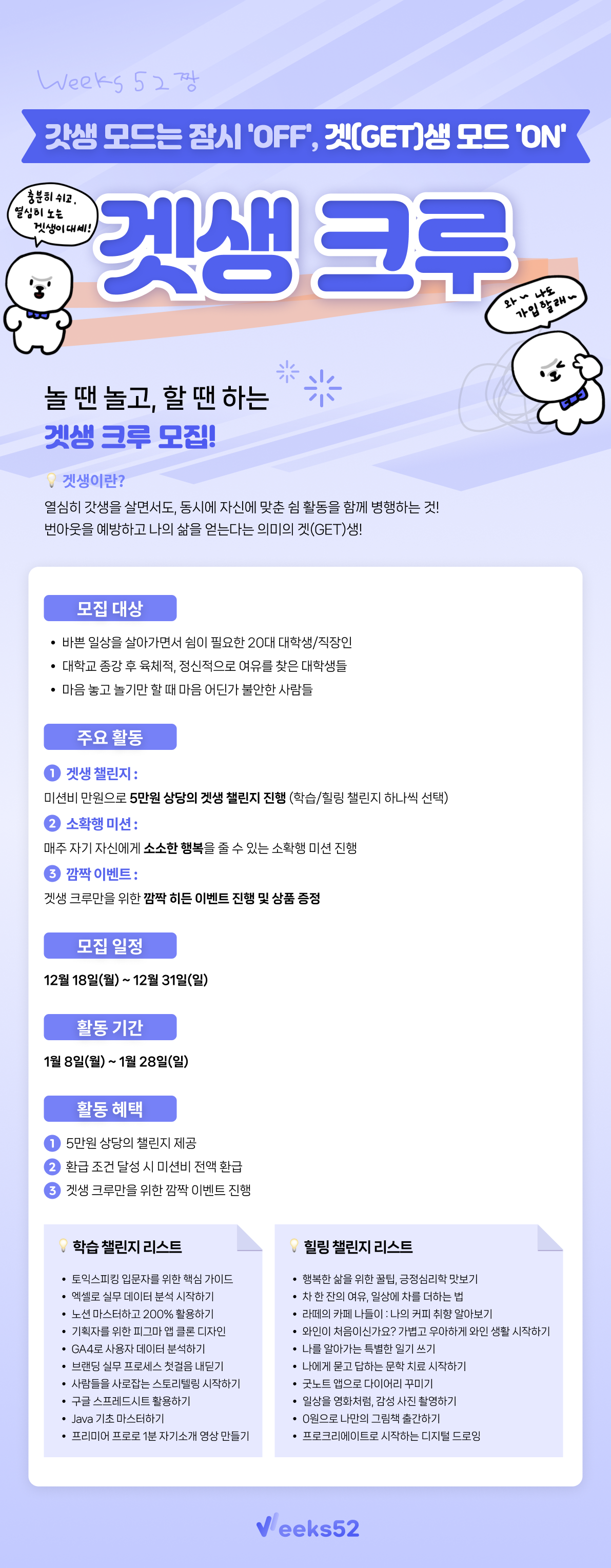 겟생 크루는 2023년도 한 해동안 갓생을 살아오느라 지친 대학생, 취준생을 위한 프로그램입니다.