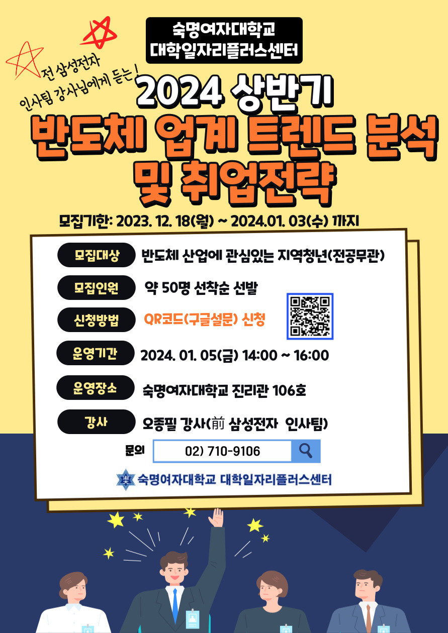 숙명여자대학교 대학일자리플러스센터에서는 반도체 산업에 관심 있는 지역청년을 대상으로 <2024 상반기 반도체 업계 트렌드 분석 및 취업전략> 특강을 진행합니다.