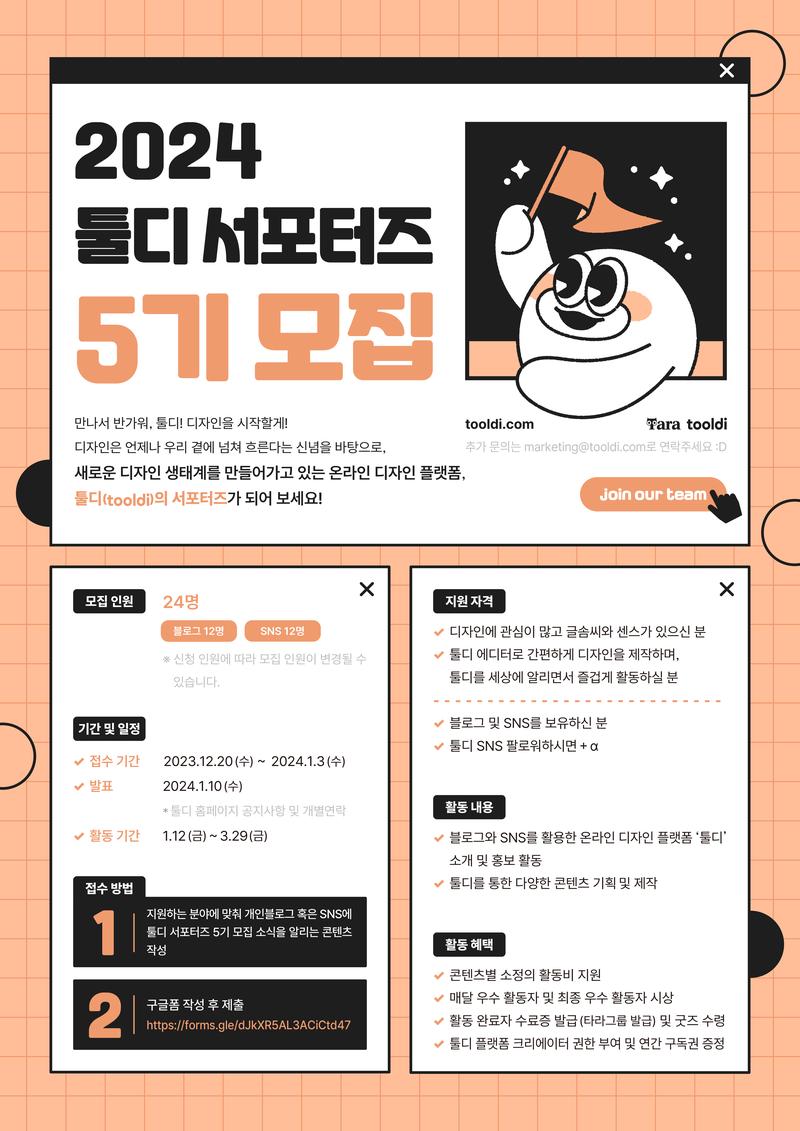 새로운 디자인 생태계를 꾸려 나가는 툴디(tooldi)의 다섯 번째 서포터즈를 모집합니다!