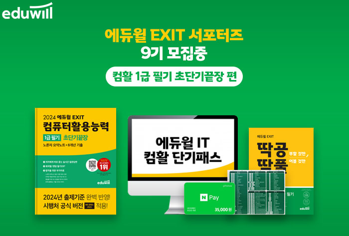 참여자 전원 | 1) 에듀윌 딱공딱풀 컴퓨터활용능력 1급 필기 (PDF/이메일발송) 2) 엑셀 단축키 마우스 패드 (실물/무료배송) 3) 에듀윌 컴퓨터활용능력 단기패스 무료 수강권 3일 (쿠폰/문자발송) |