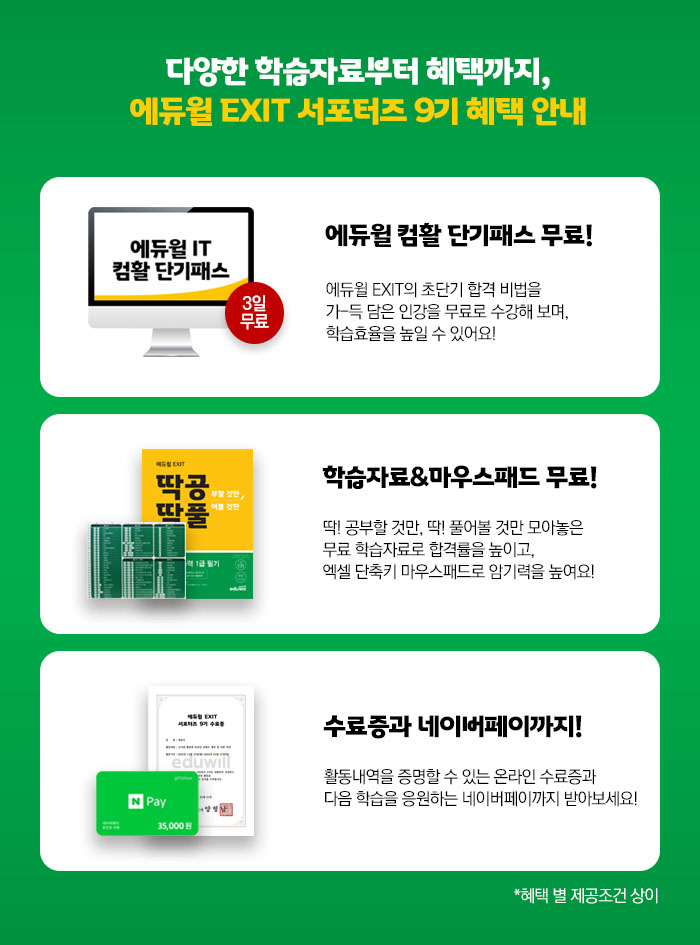 수료자 전원 | 1) 네이버페이 3만 5천 원권 (쿠폰/문자발송) 2) 에듀윌 EXIT 서포터즈 9기 온라인 수료증 (PDF/이메일발송) |