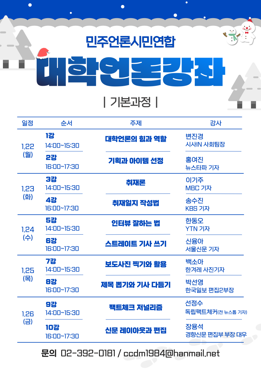 수강료 : 대면 12만원, 비대면 10만원 (민언련 회원 및 회원자녀 50% 할인)