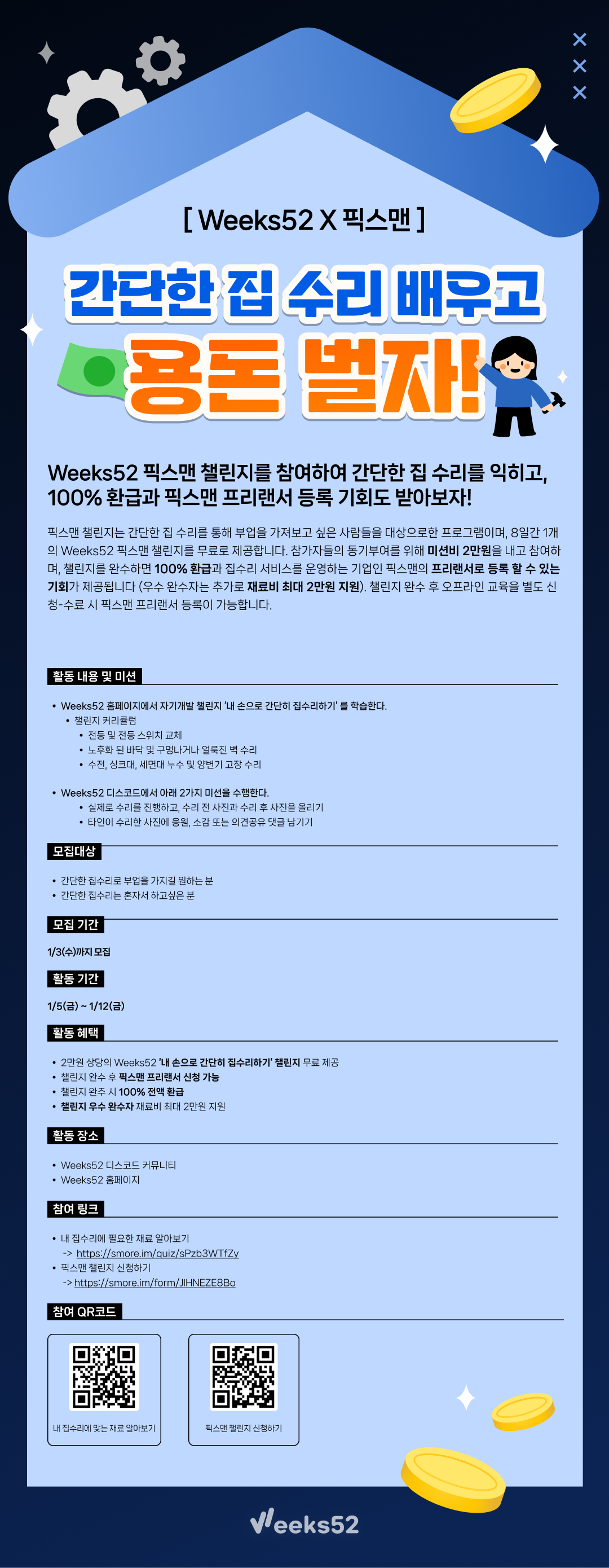 픽스맨 챌린지는 간단한 집 수리를 통해 부업을 가져보고 싶은 사람들을 대상으로한 프로그램이며, 8일간 1개의 Weeks52 픽스맨 챌린지를 무료로 제공합니다. 참가자들의 동기부여를 위해 미션비 2만원을 내고 참여하며, 챌린지를 완수하면 100% 환급과 집수리 서비스를 운영하는 기업인 픽스맨의 프리랜서로 등록 할 수 있는 기회가 제공됩니다 (우수 완수자는 추가로 재료비 최대 2만원 지원). 챌린지 완수 후 오프라인 교육을 별도 신청-수료 시 픽스맨 프리랜서 등록이 가능합니다.